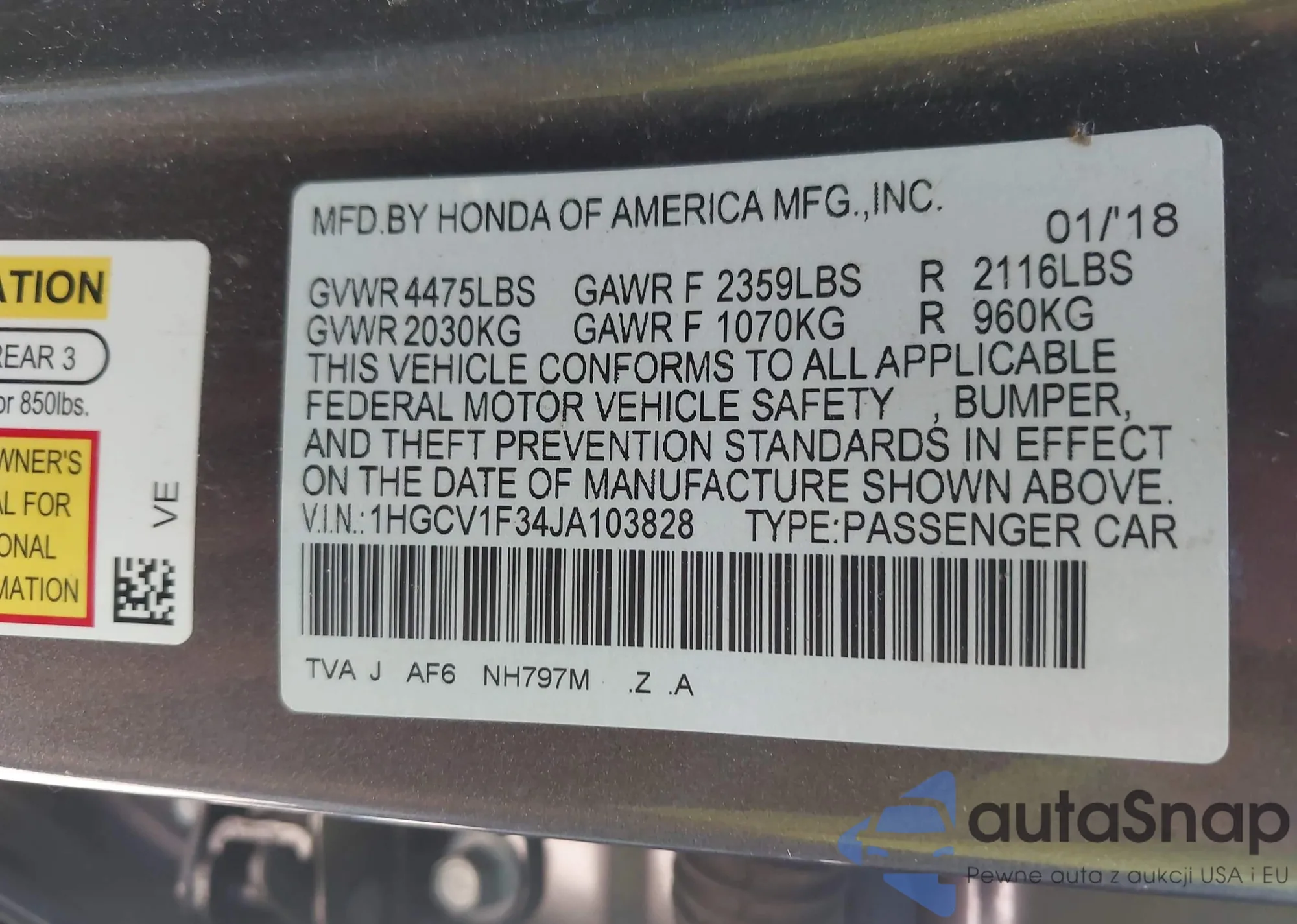 LOT: 42934431 VIN: 1HGCV3F99KA006142