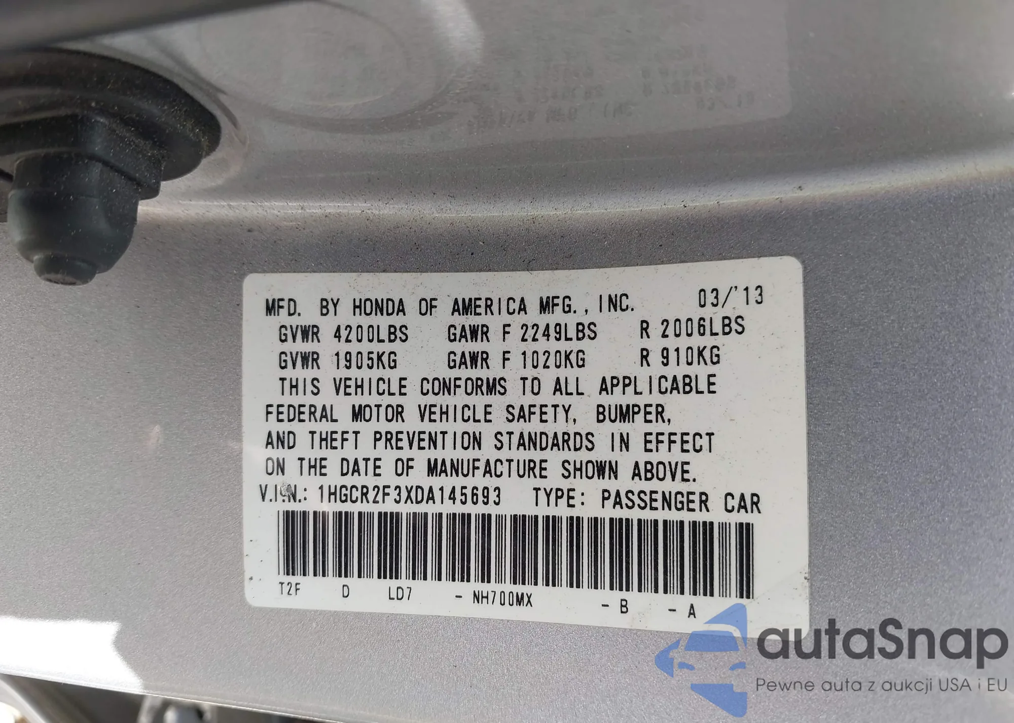 2013 Honda Accord Lx from USA, damaged, VIN 1HGCR2F3XDA145693