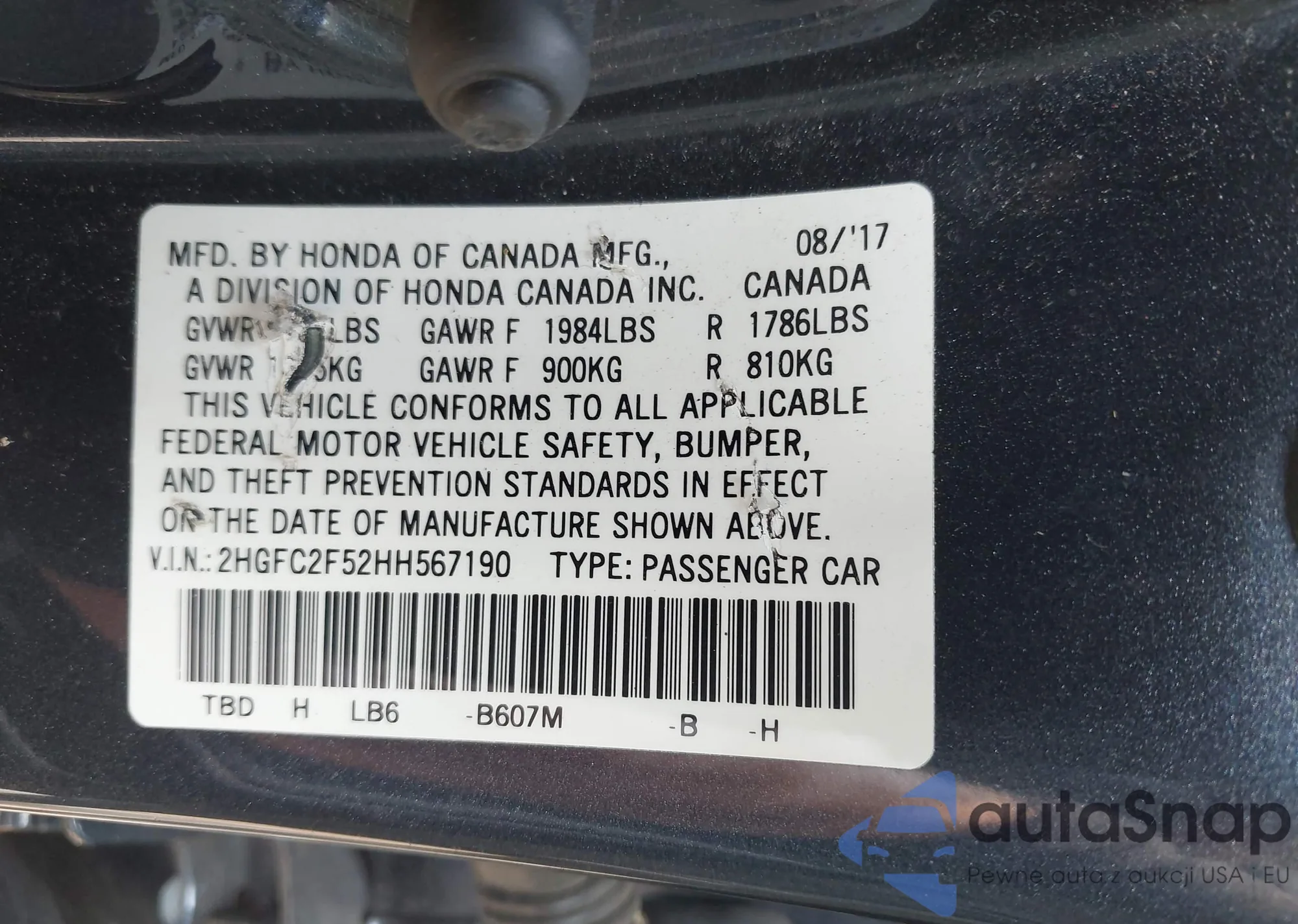 • VIN 2HGFC2F52HH567190