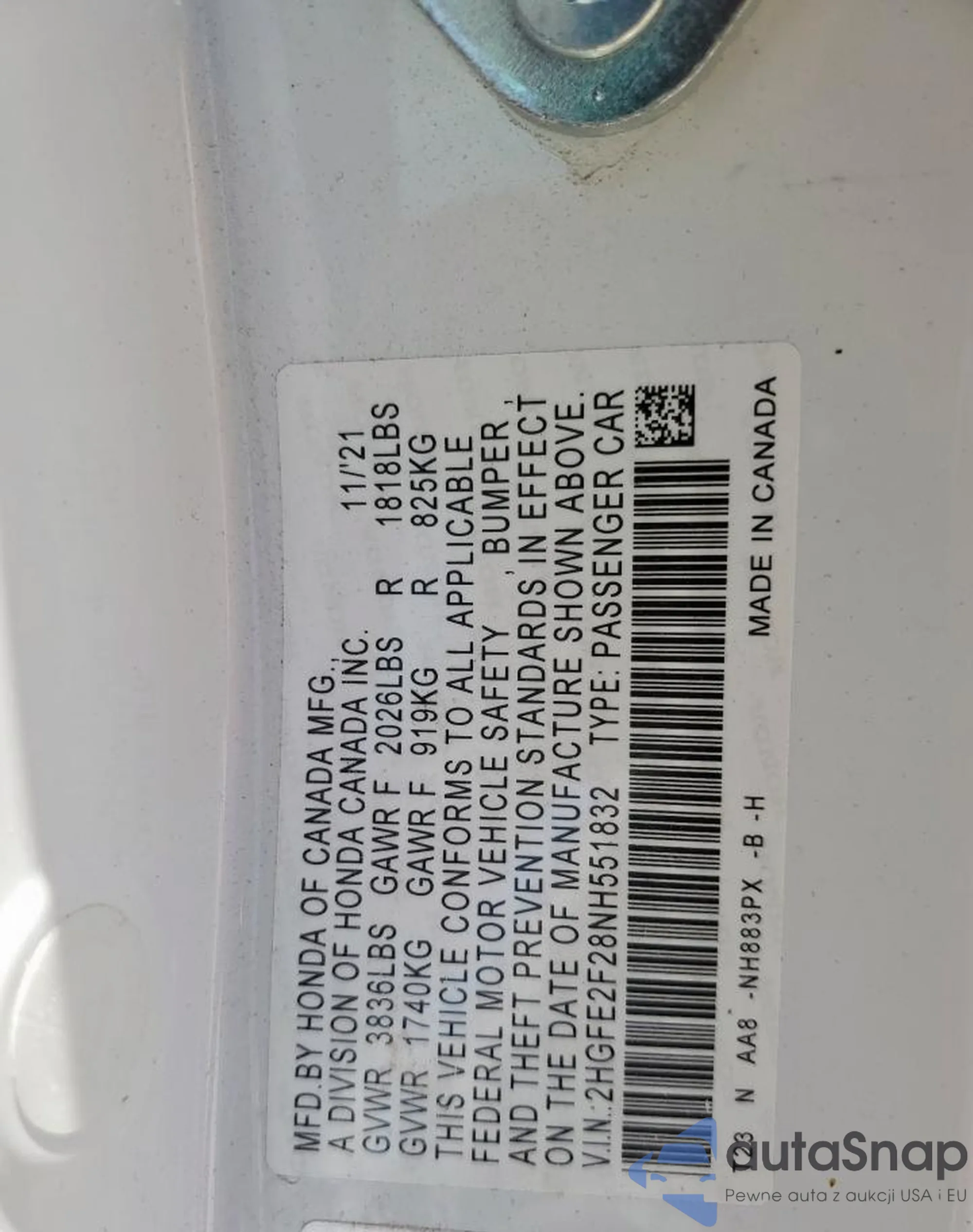 LOT: 67578305 VIN: 2HGFE2F28NH551832