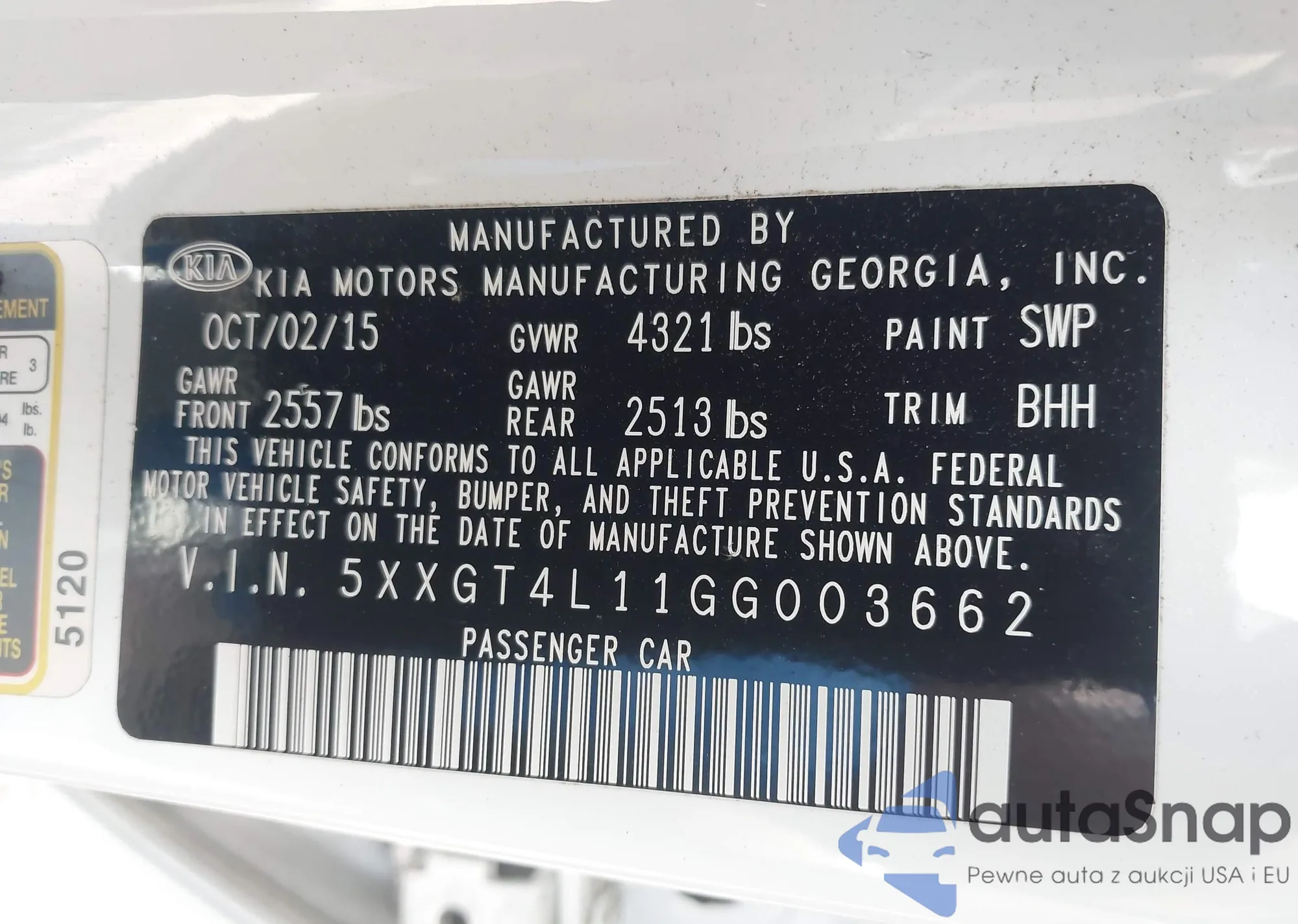LOT: 42625431 VIN: 5XXGT4L11GG003662