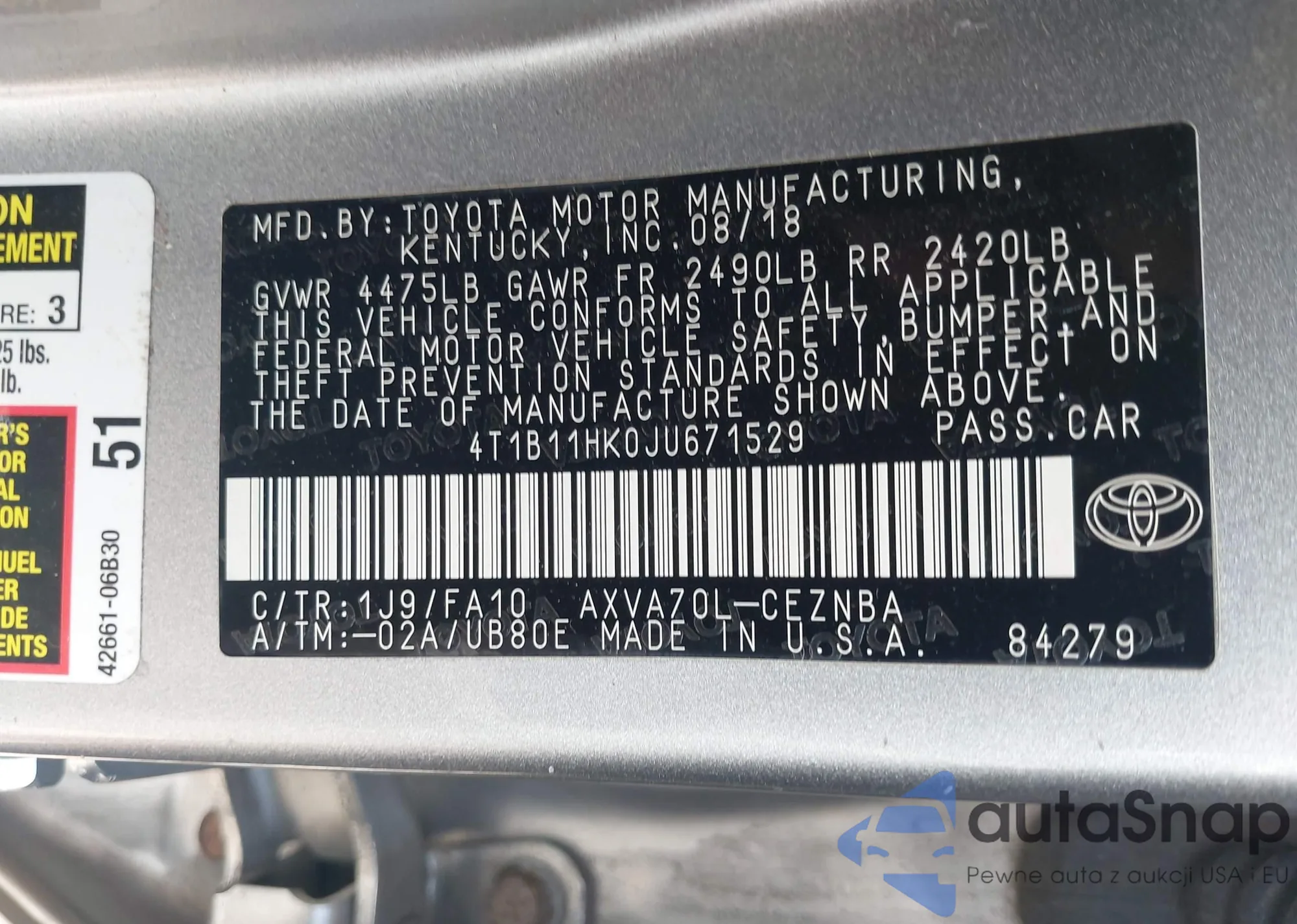 LOT: 42798268 VIN: 4T1B11HK0JU671529