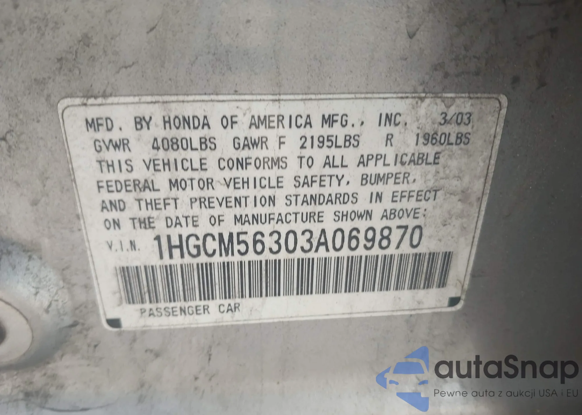 LOT: 42574517 VIN: 1HGCM56303A069870