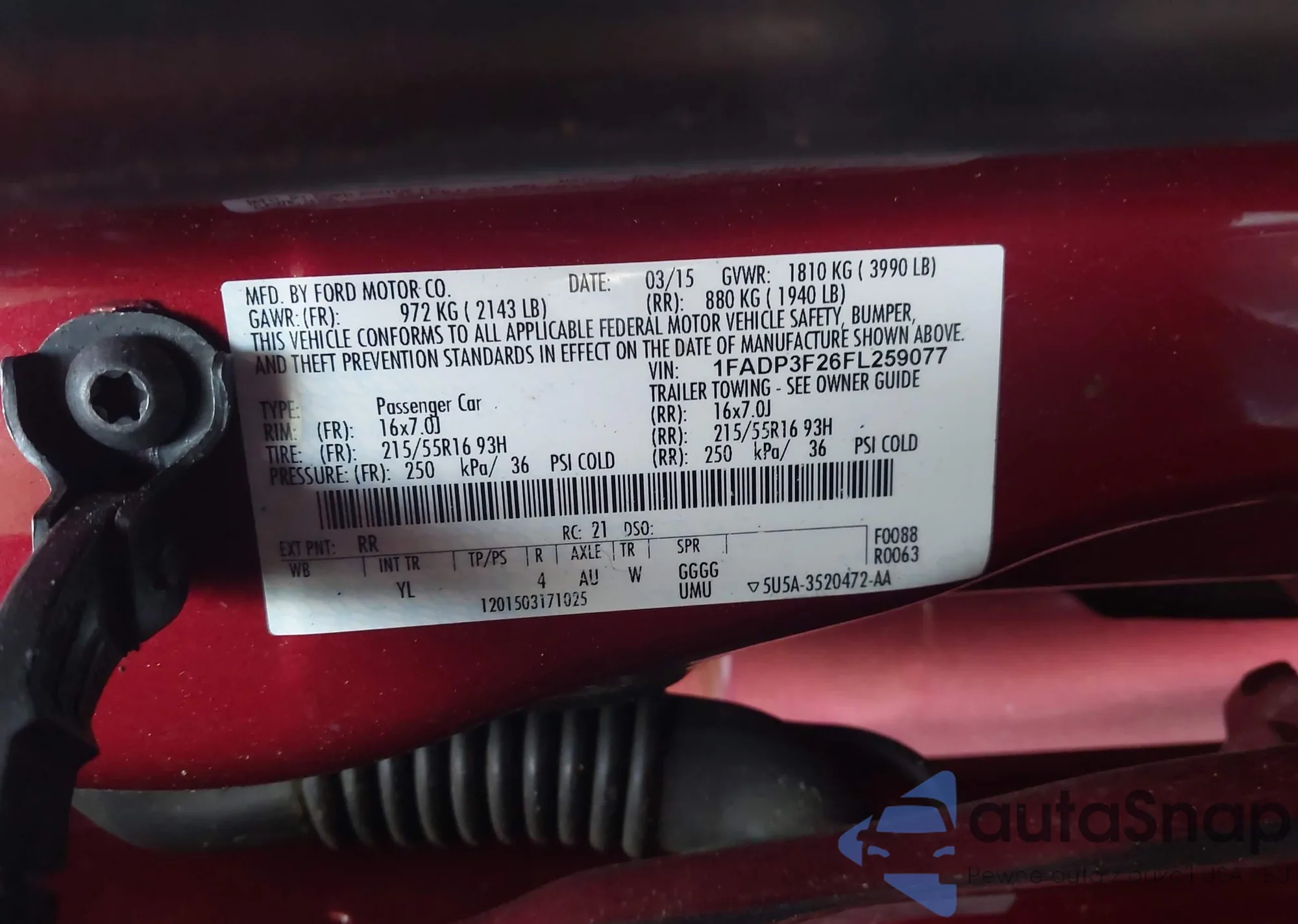 • VIN 1FADP3F26FL259077