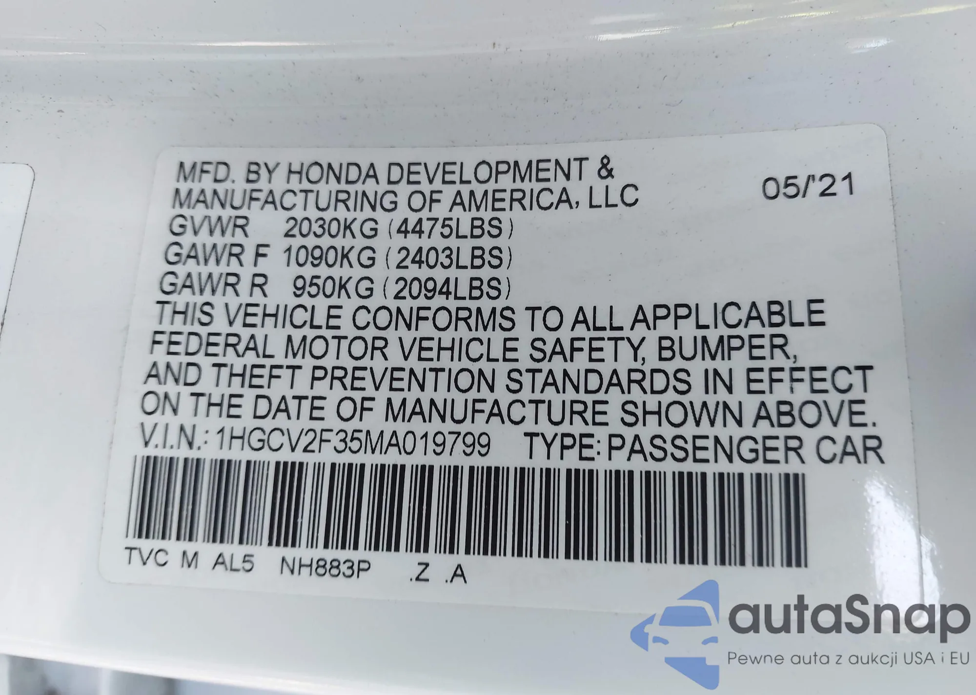 LOT: 41626012 VIN: 1HGCV2F35MA019799
