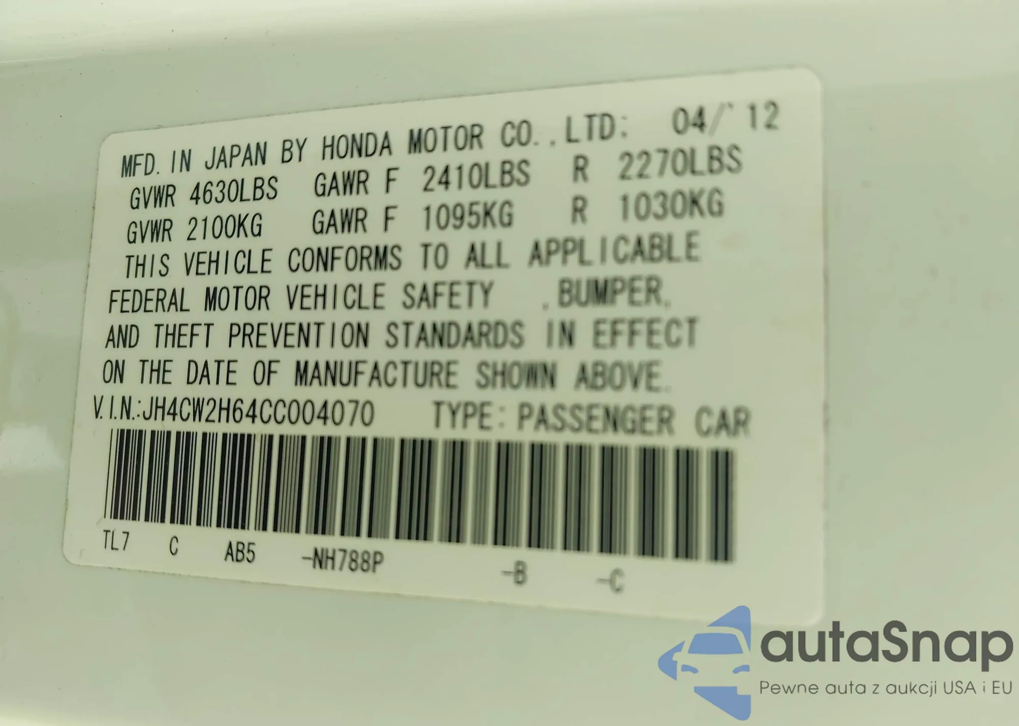 • VIN 5FNRL6H79JB057481