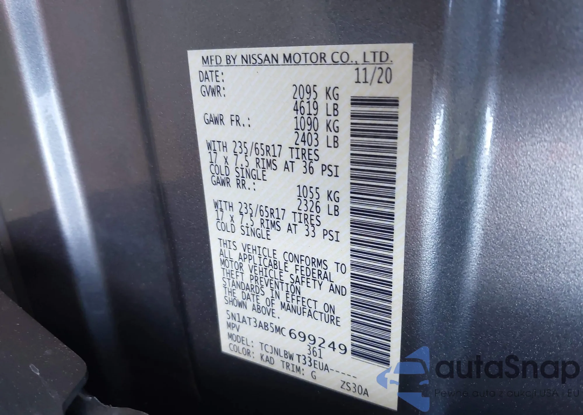 • VIN 5N1AT3AB5MC699249