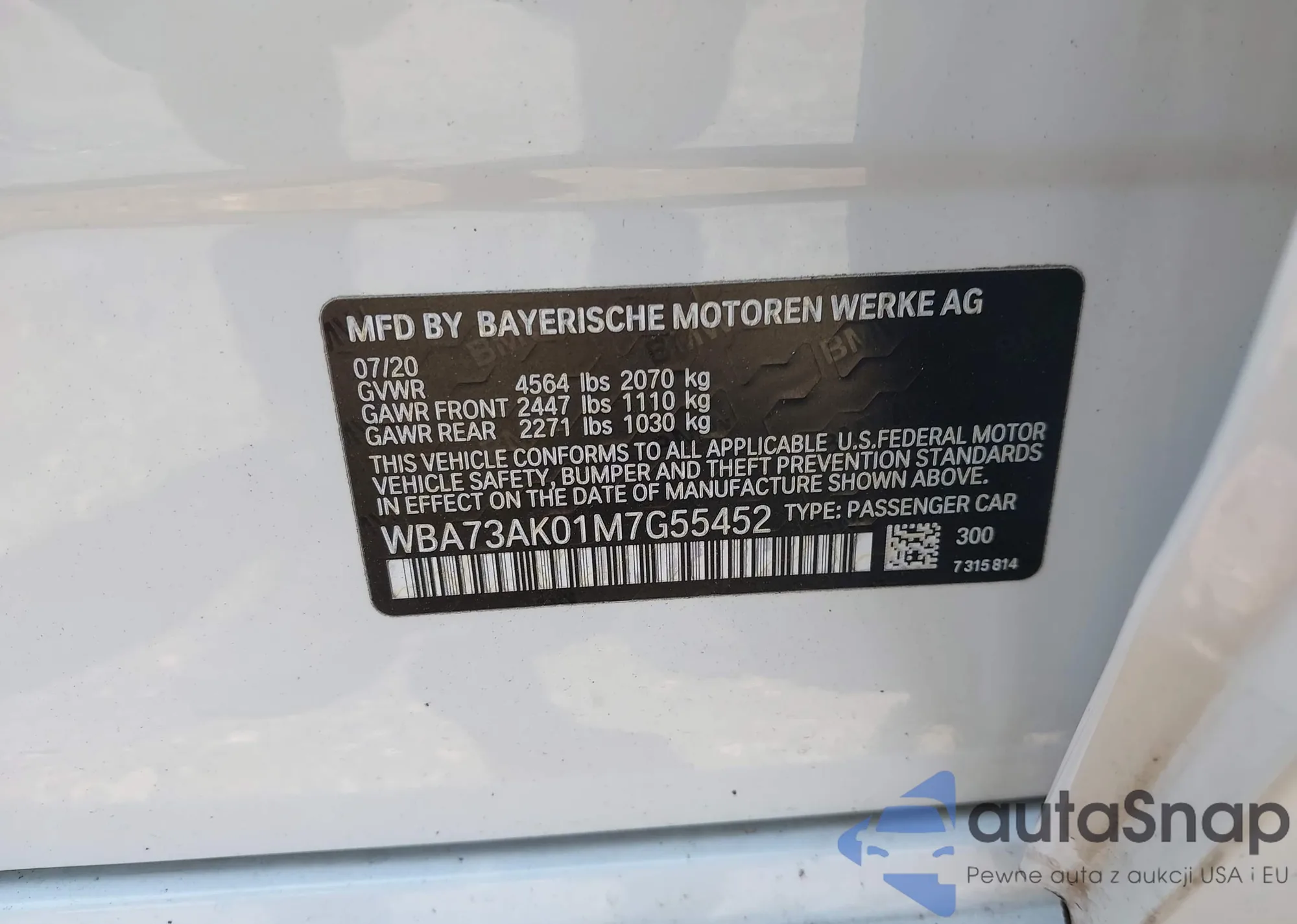 • VIN WBA73AK01M7G55452