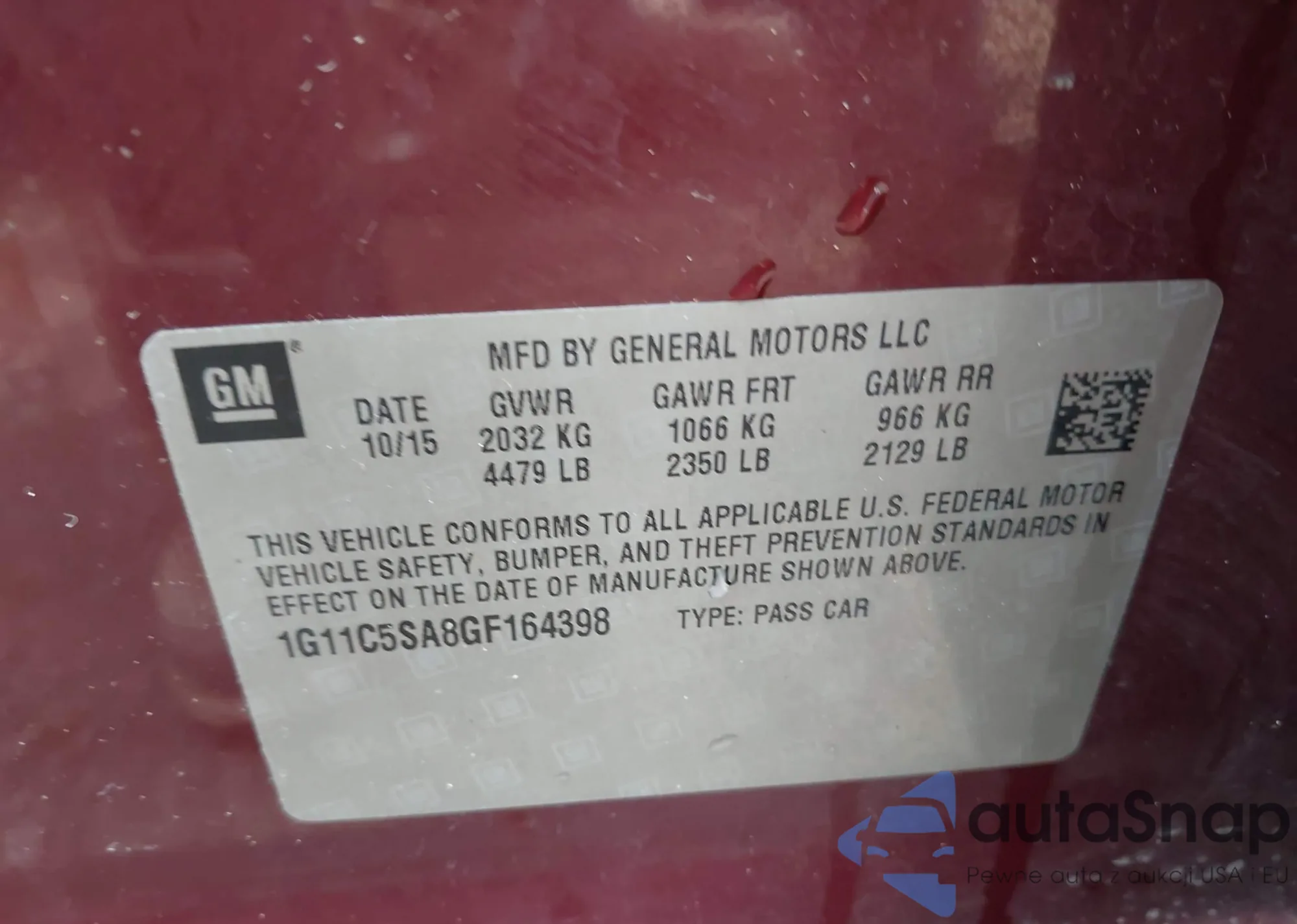LOT: 42852830 VIN: 1G11C5SA8GF164398
