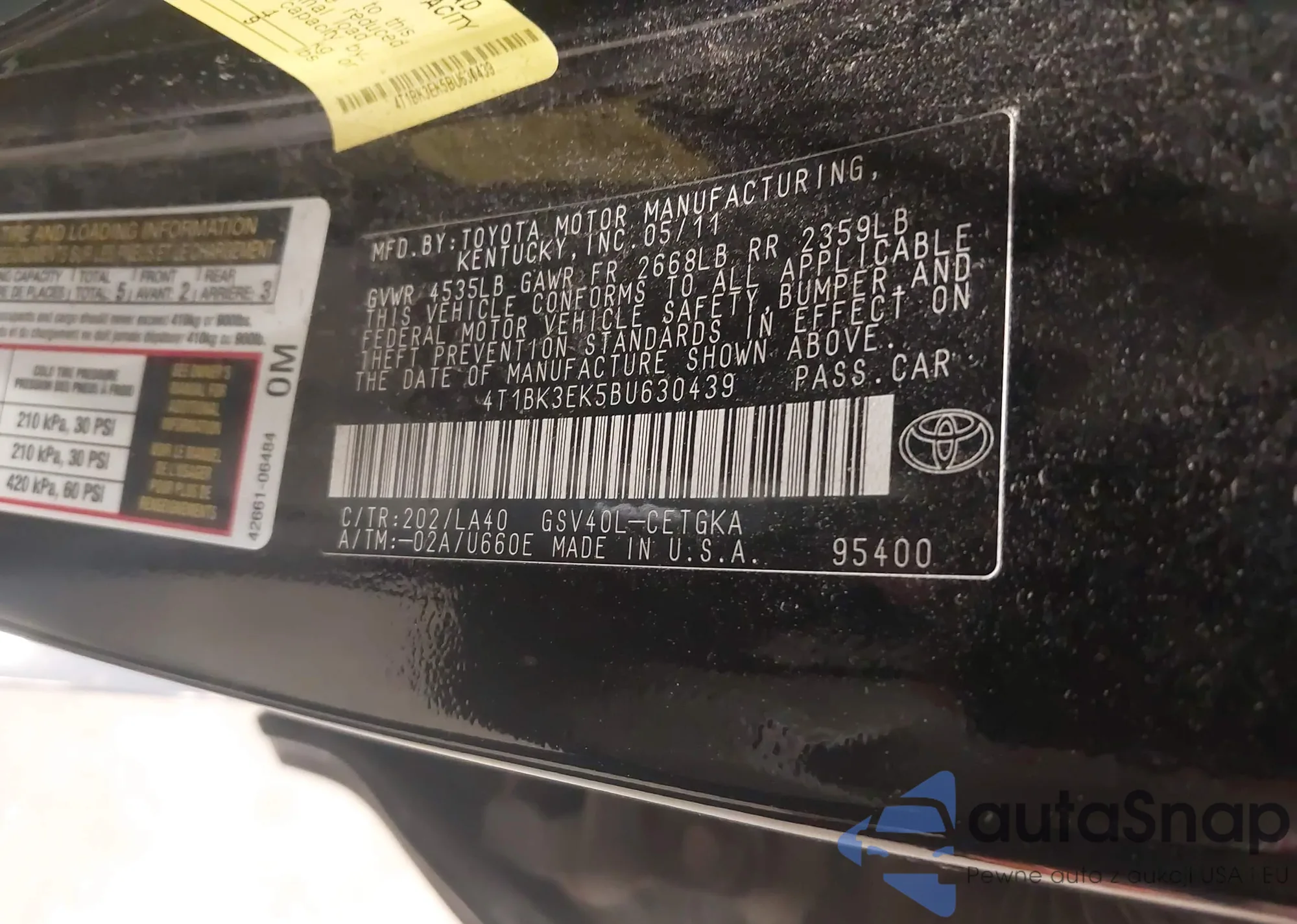 LOT: 42919760 VIN: 4T1BK3EK5BU630439