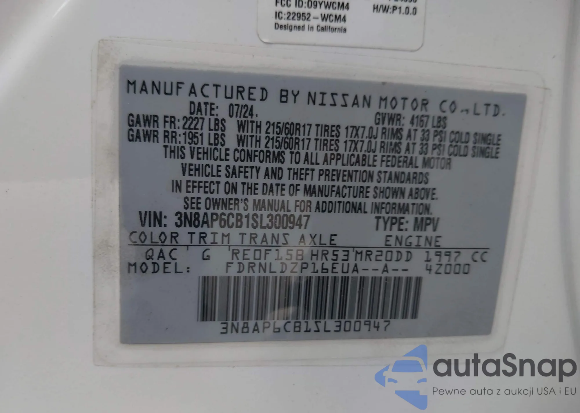 LOT: 42928668 VIN: 3N8AP6CB1SL300947