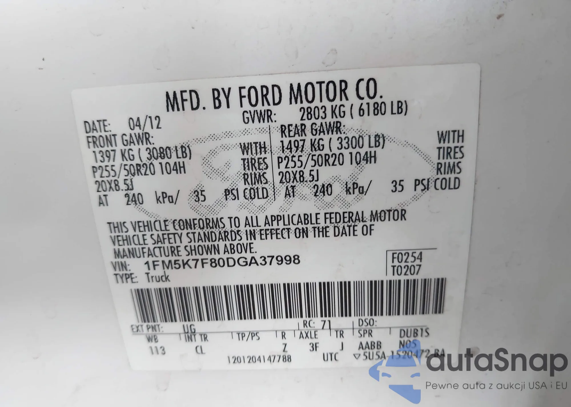 LOT: 42969106 VIN: 1FM5K7F80DGA37998