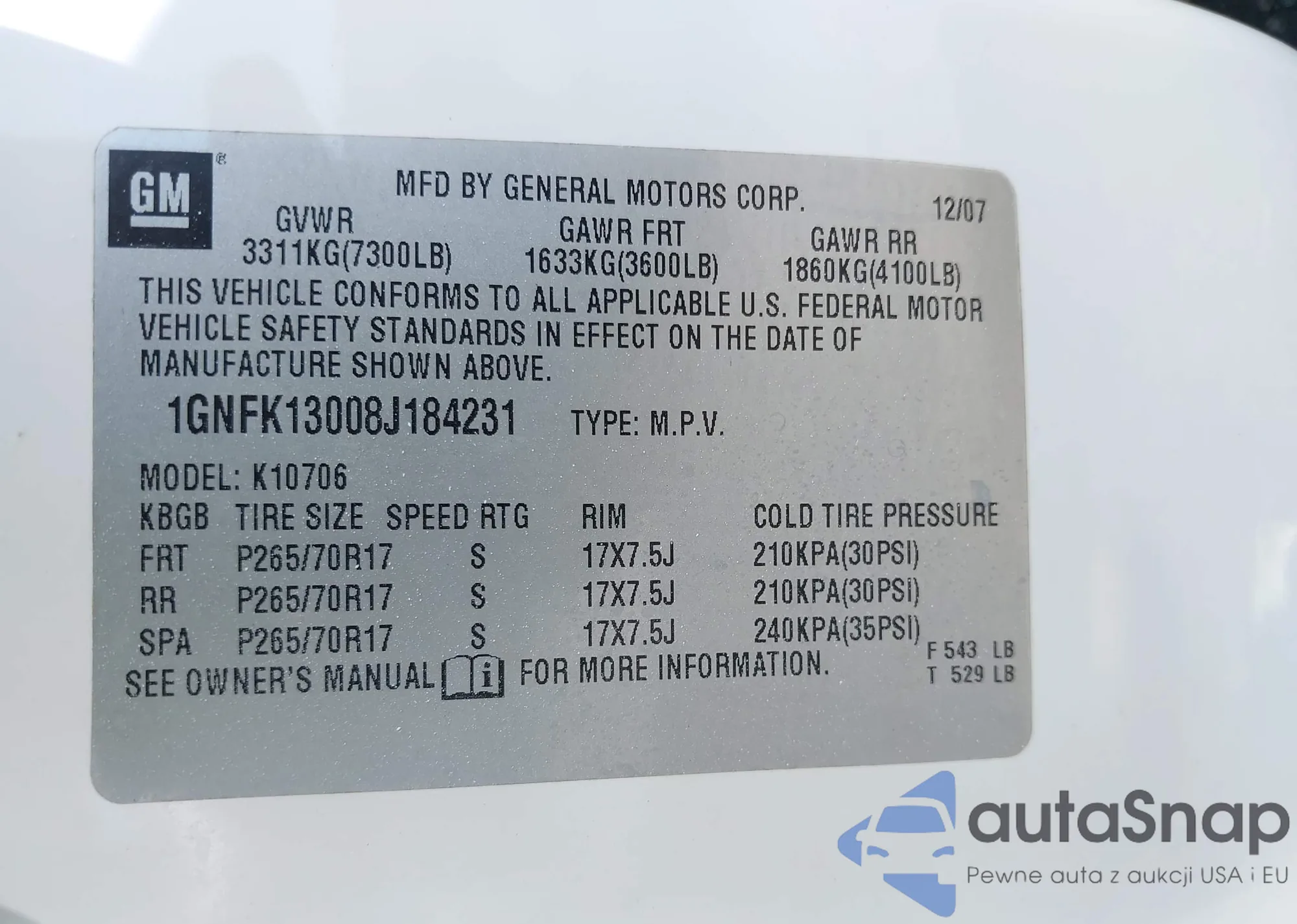 LOT: 42697605 VIN: 1GNFK13008J184231