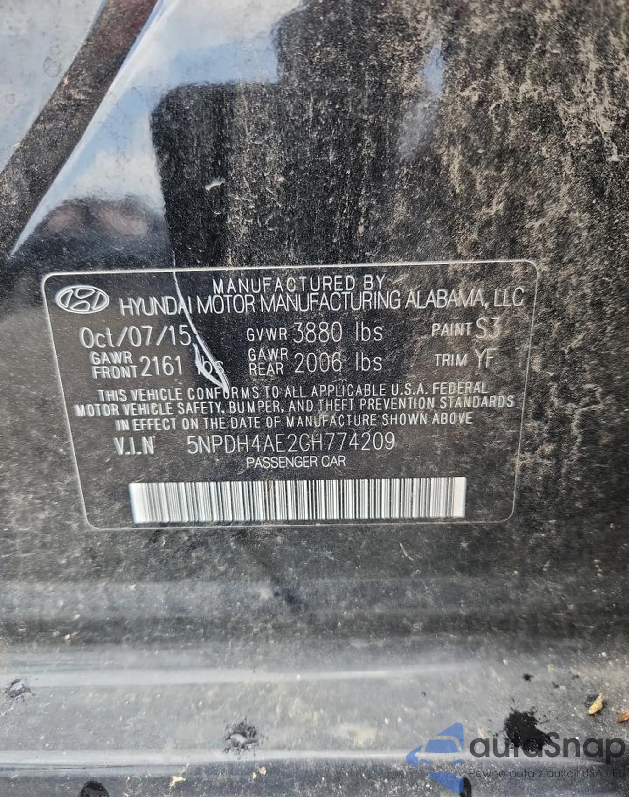 LOT: 63459105 VIN: 5NPDH4AE2GH774209