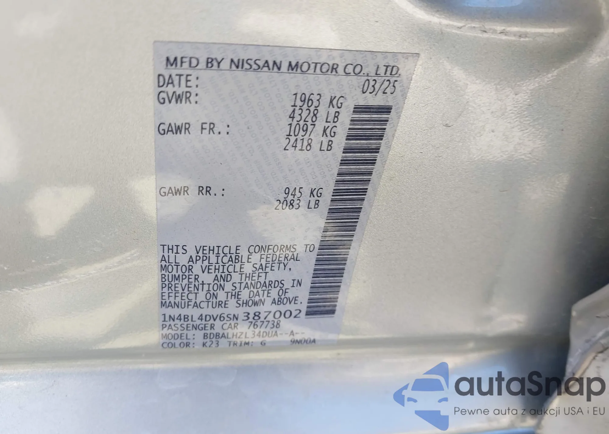 LOT: 42986402 VIN: 1N4BL4DV6SN387002
