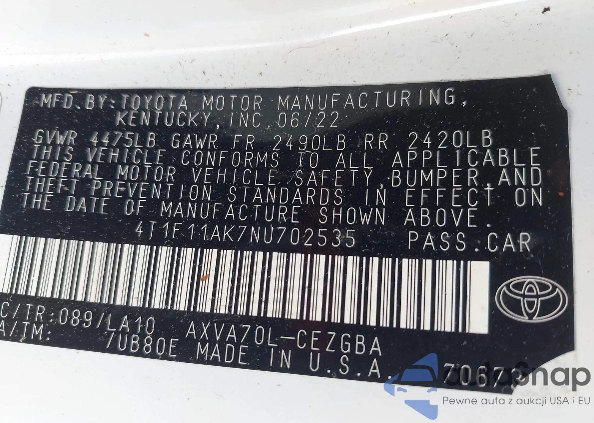 • VIN 4T1F11AK7NU702535