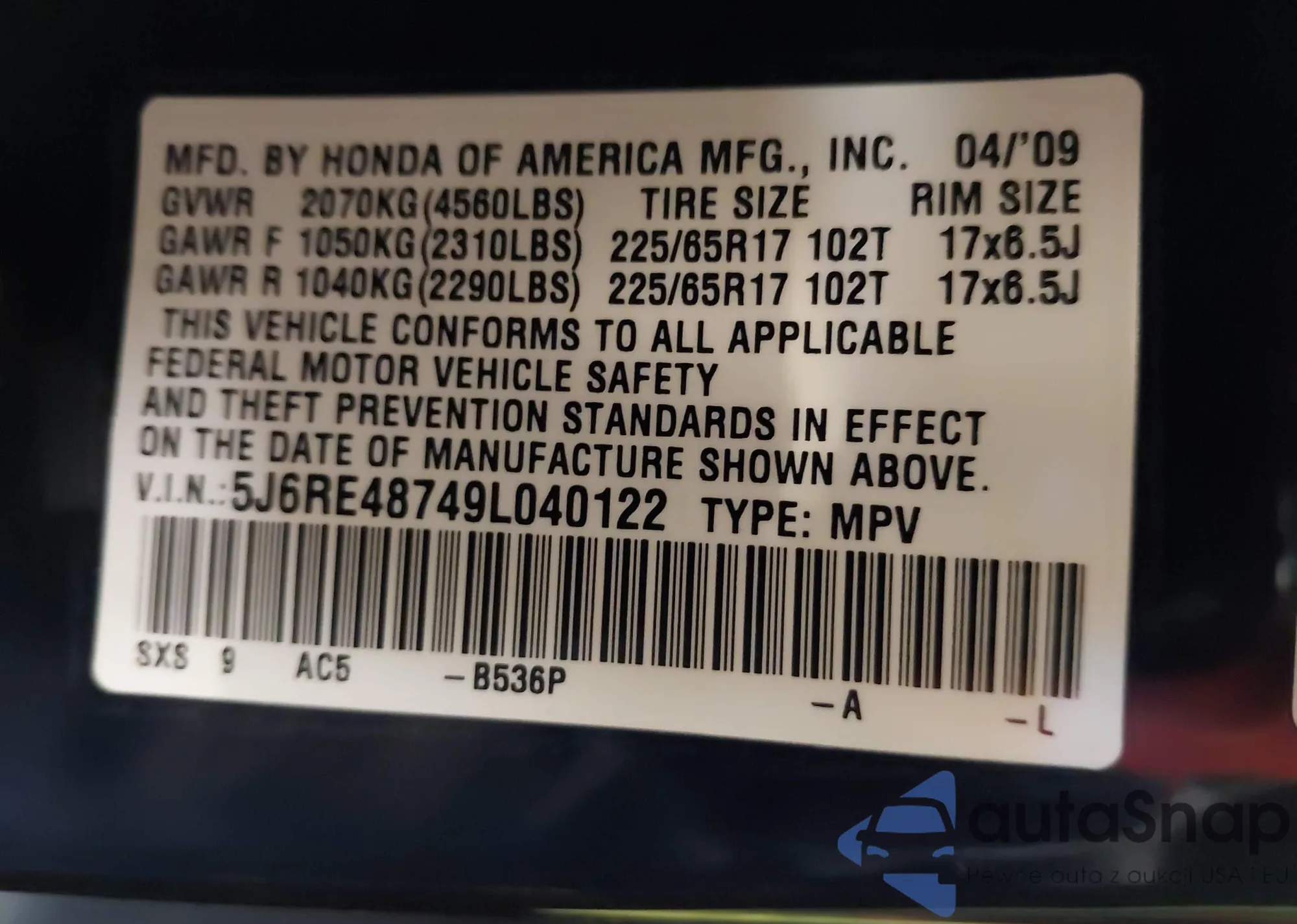 • VIN 5J6RE48749L040122