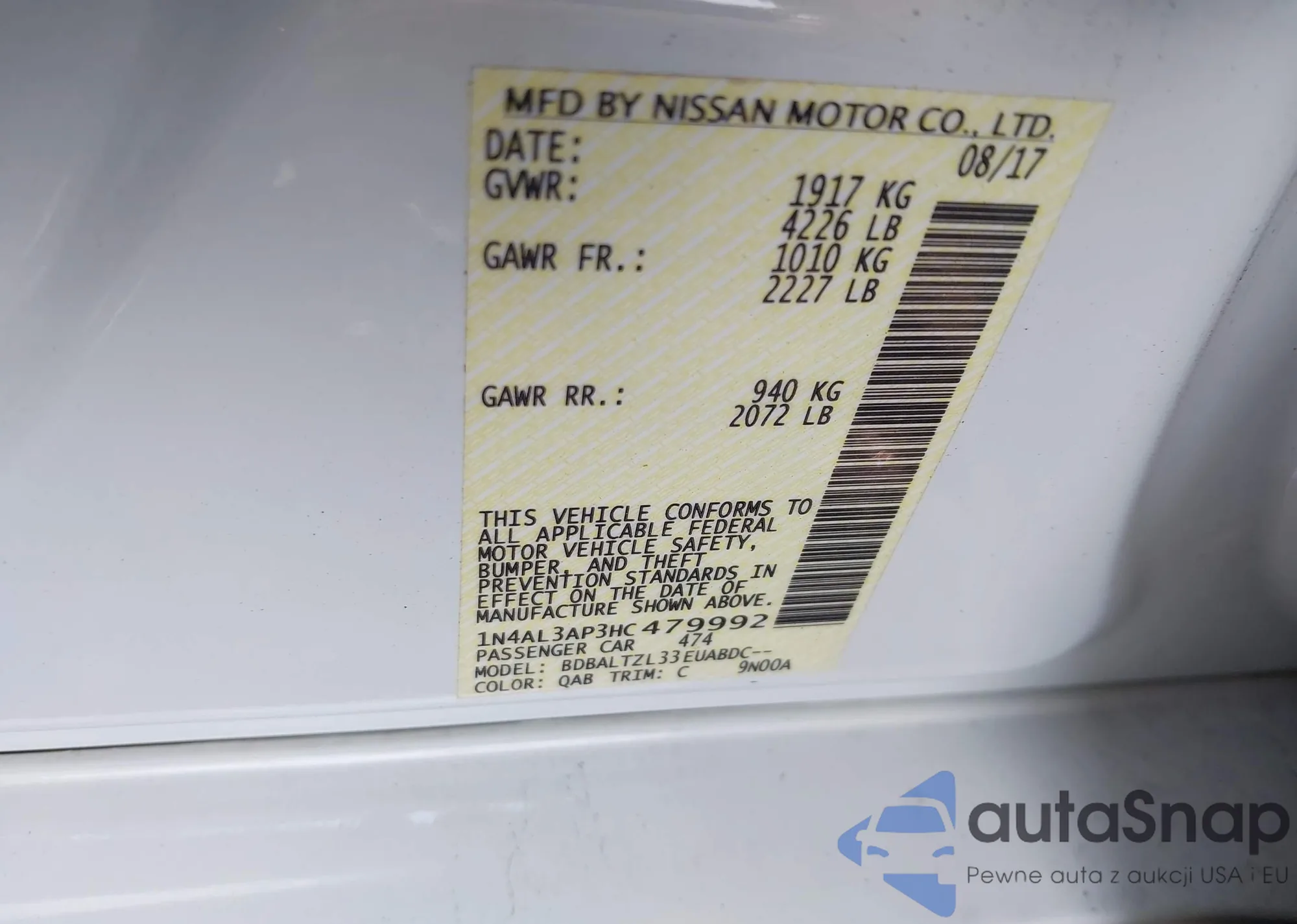 LOT: 42945136 VIN: 1N4AL3AP3HC479992