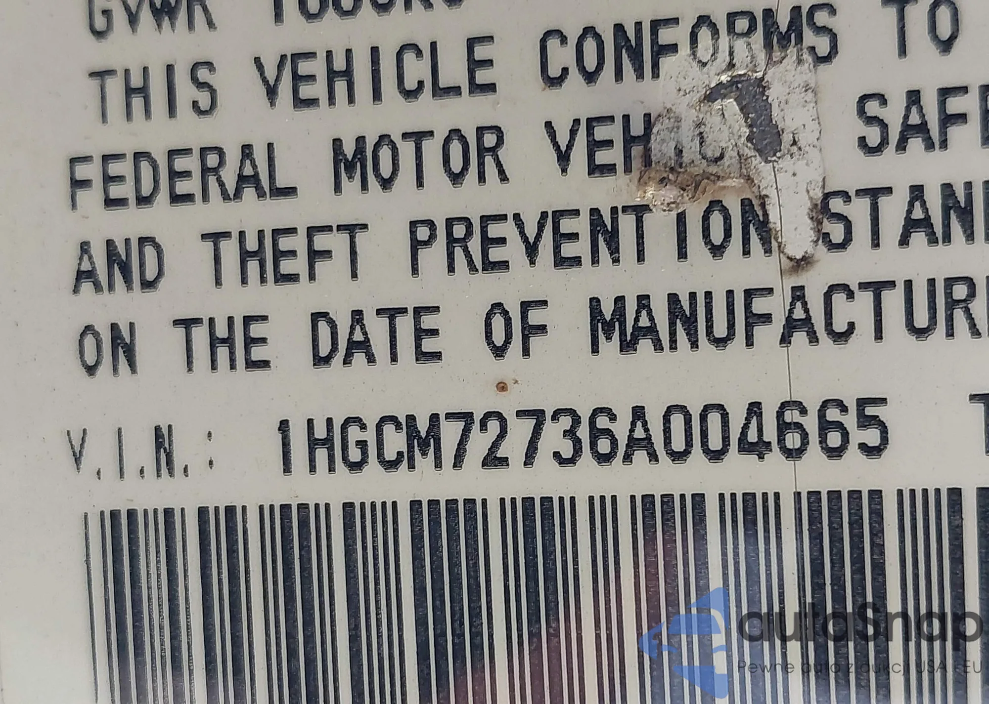 LOT: 42664431 VIN: 1HGCM72736A004665