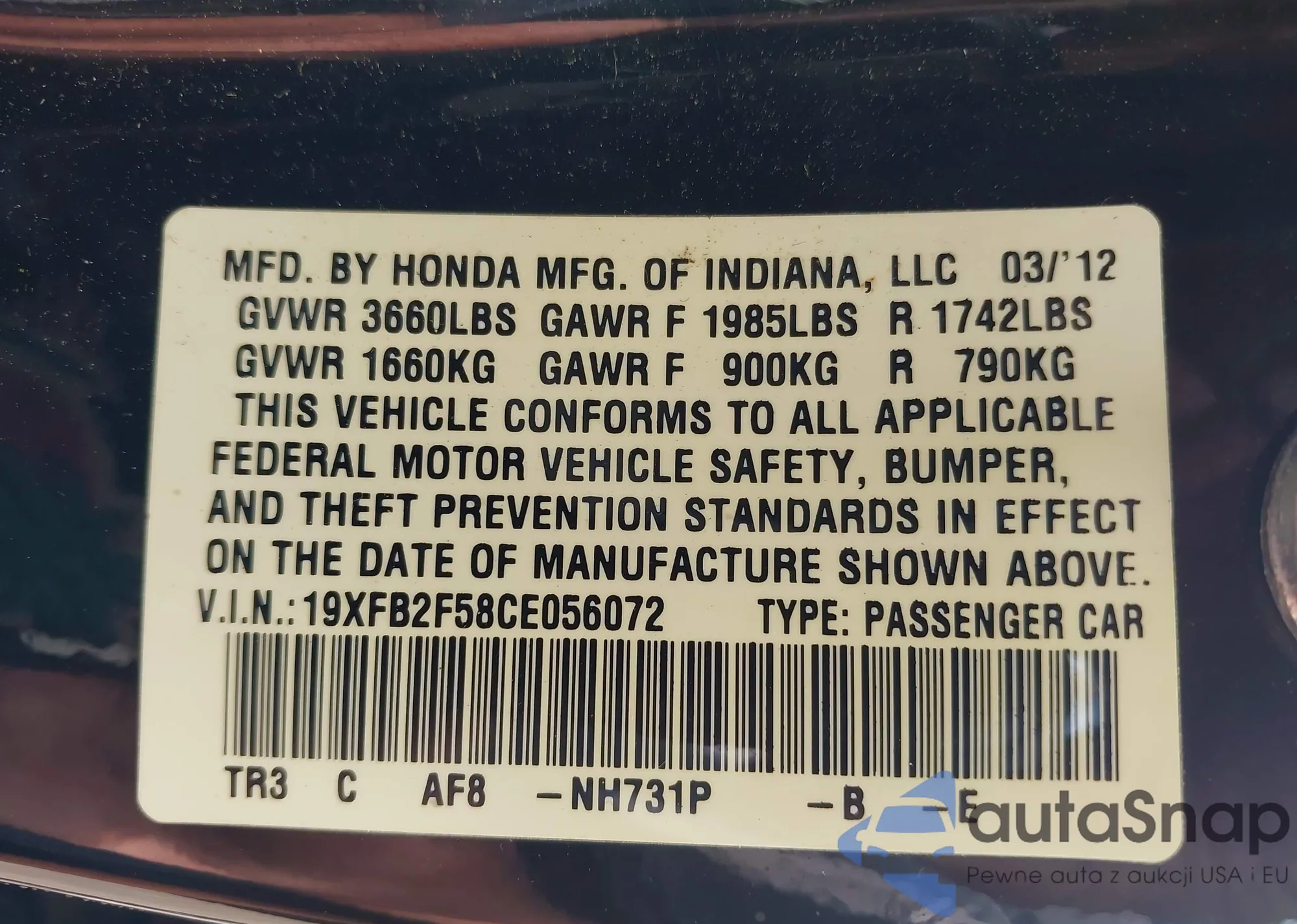 • VIN 19XFB2F58CE056072