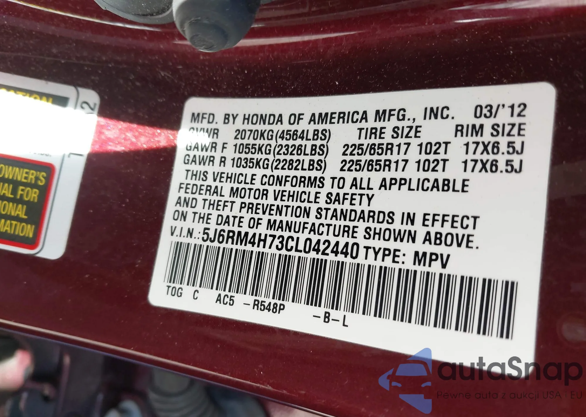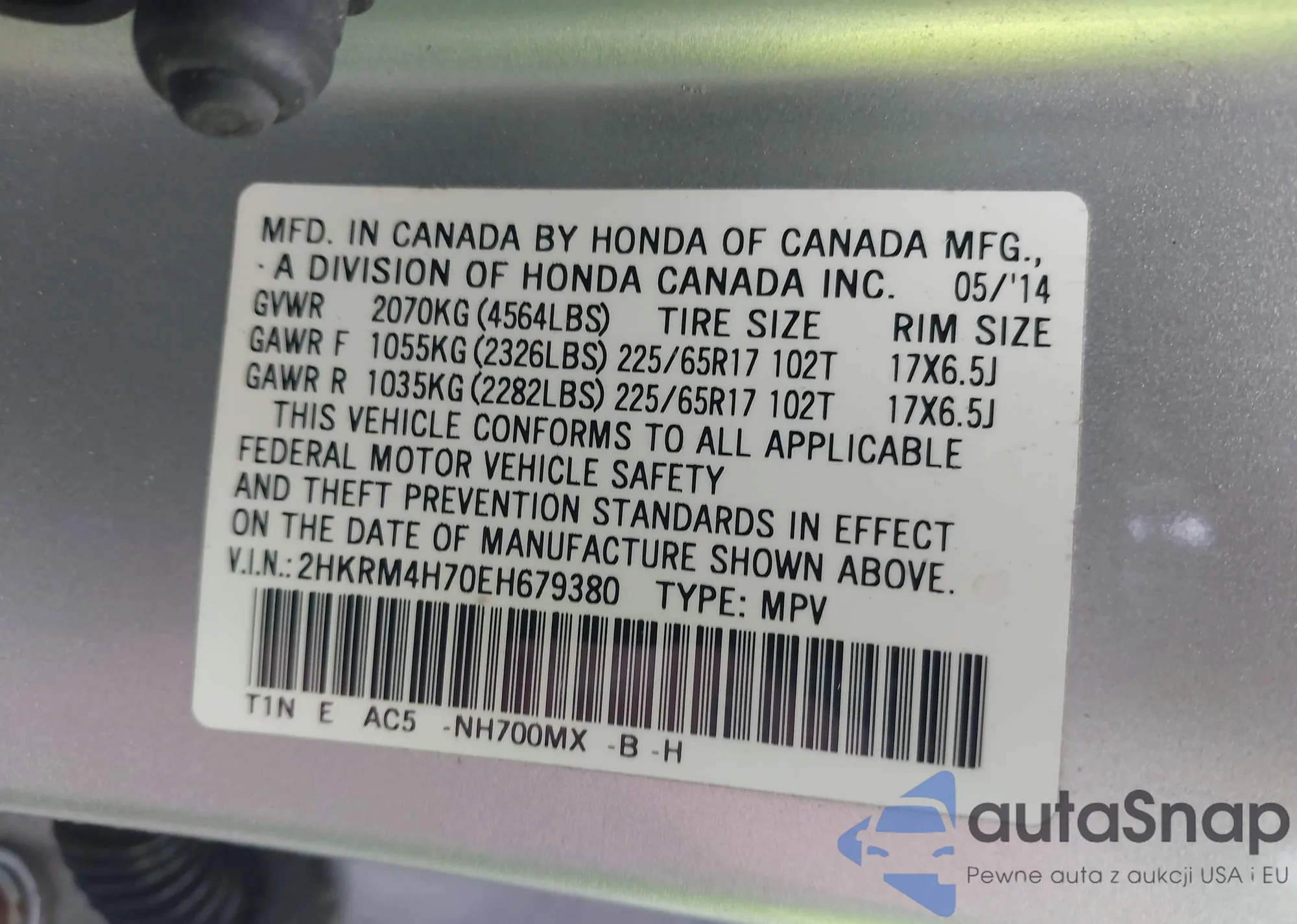 • VIN 2HKRM4H70EH679380