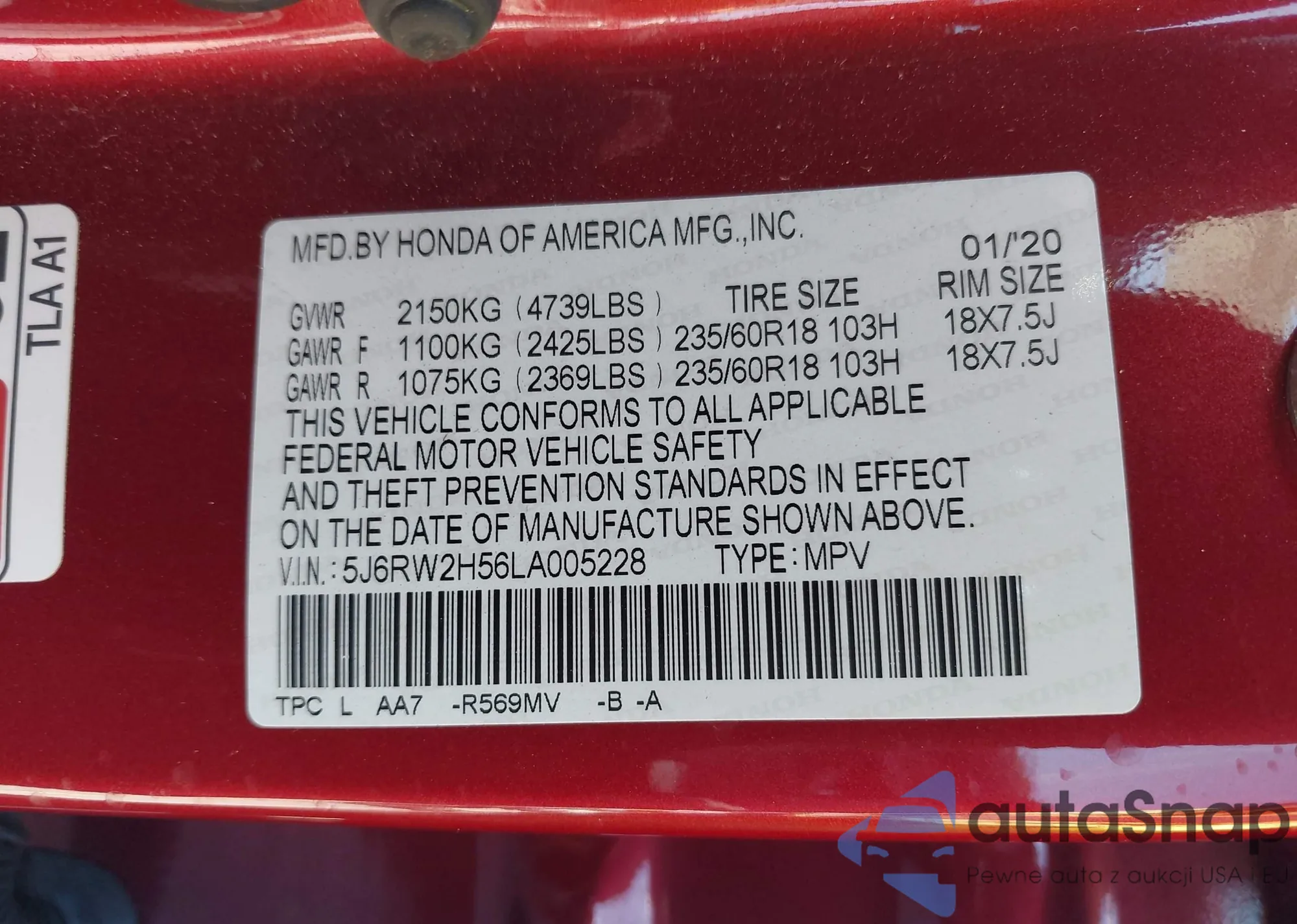 • VIN 5J6RW2H56LA005228