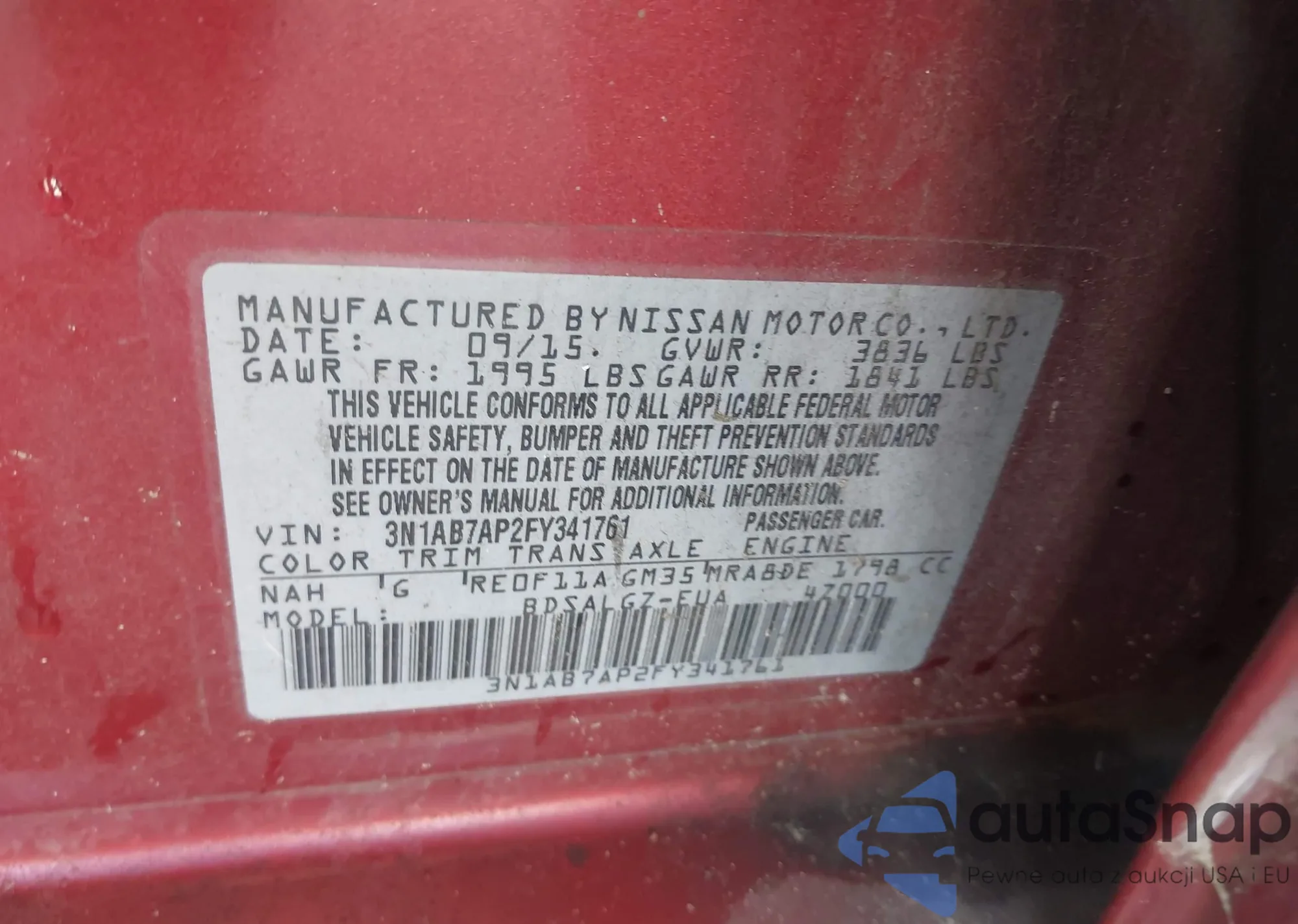 LOT: 42273541 VIN: 3N1AB7AP2FY341761