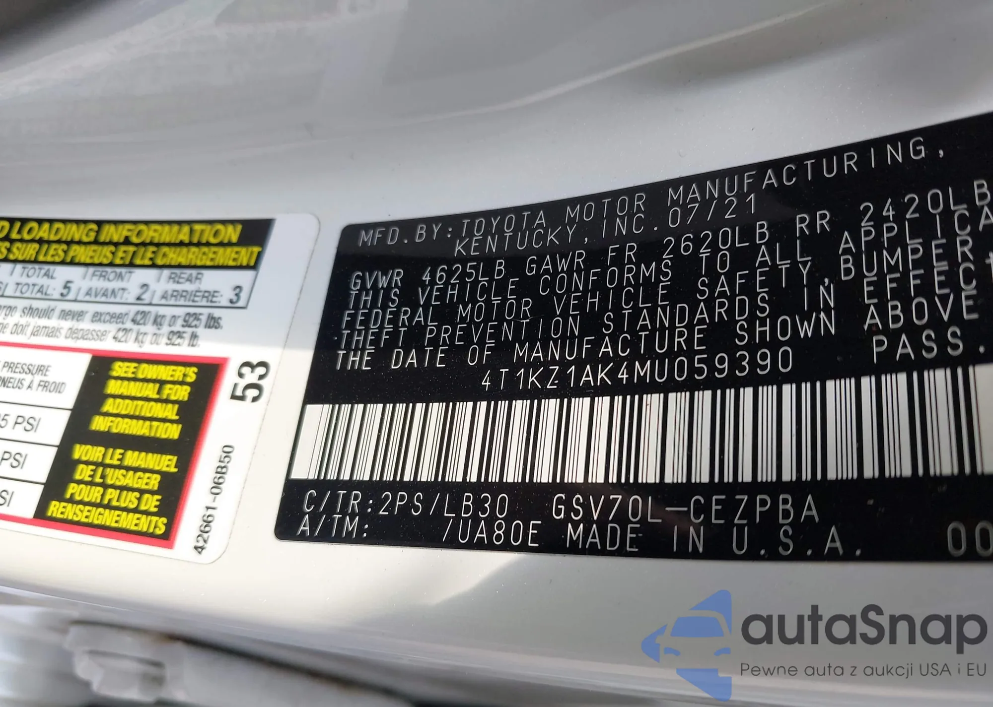LOT: 42914344 VIN: 4T1KZ1AK4MU059390