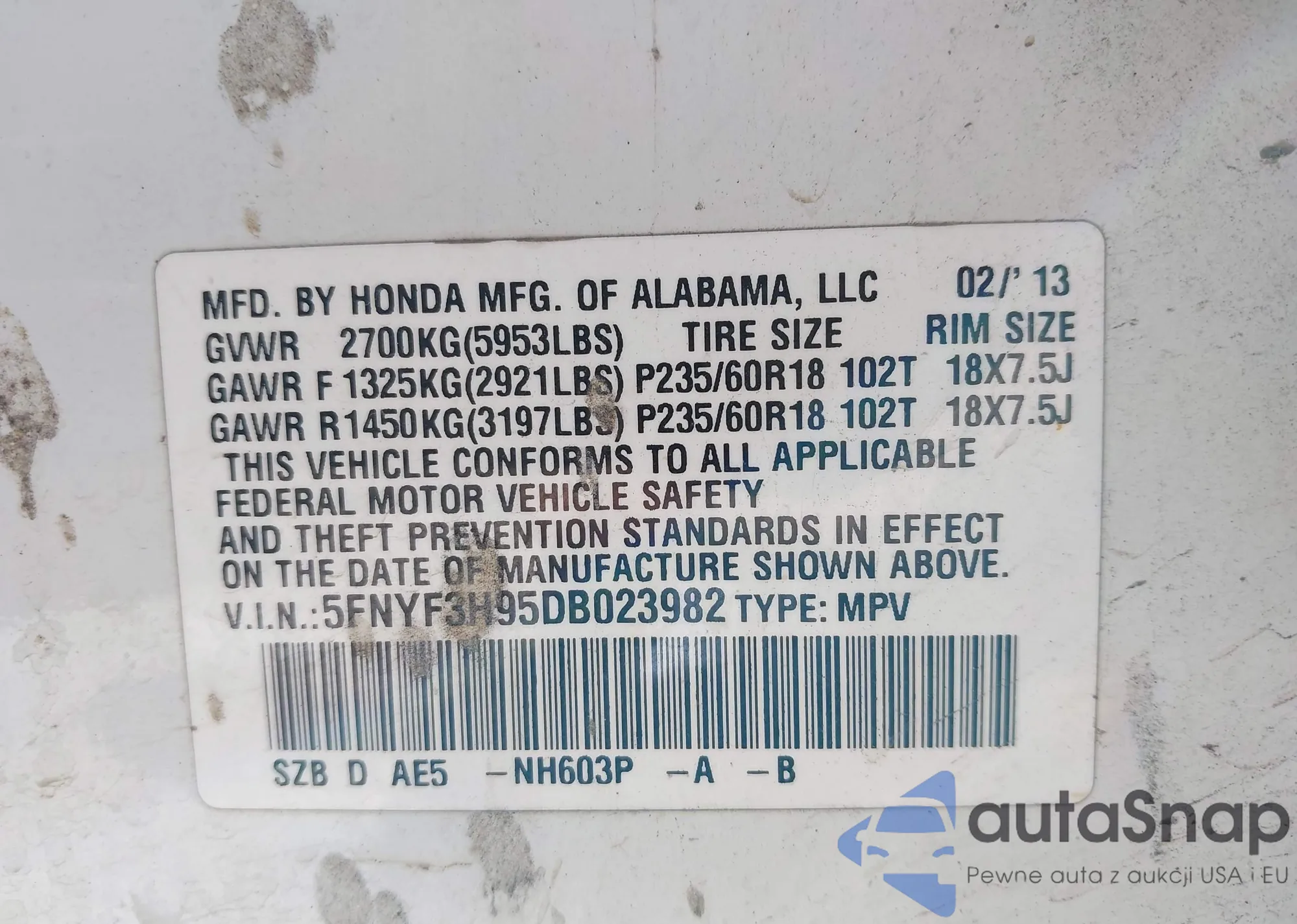 LOT: 42790219 VIN: 5FNYF3H95DB023982