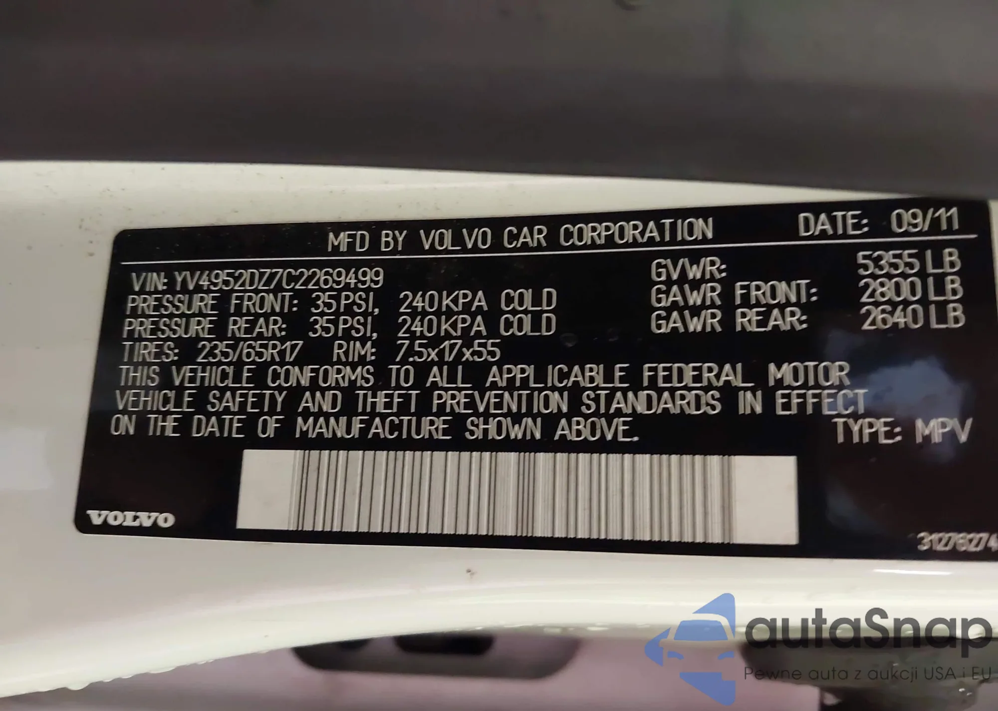 LOT: 42914056 VIN: YV4952DZ7C2269499