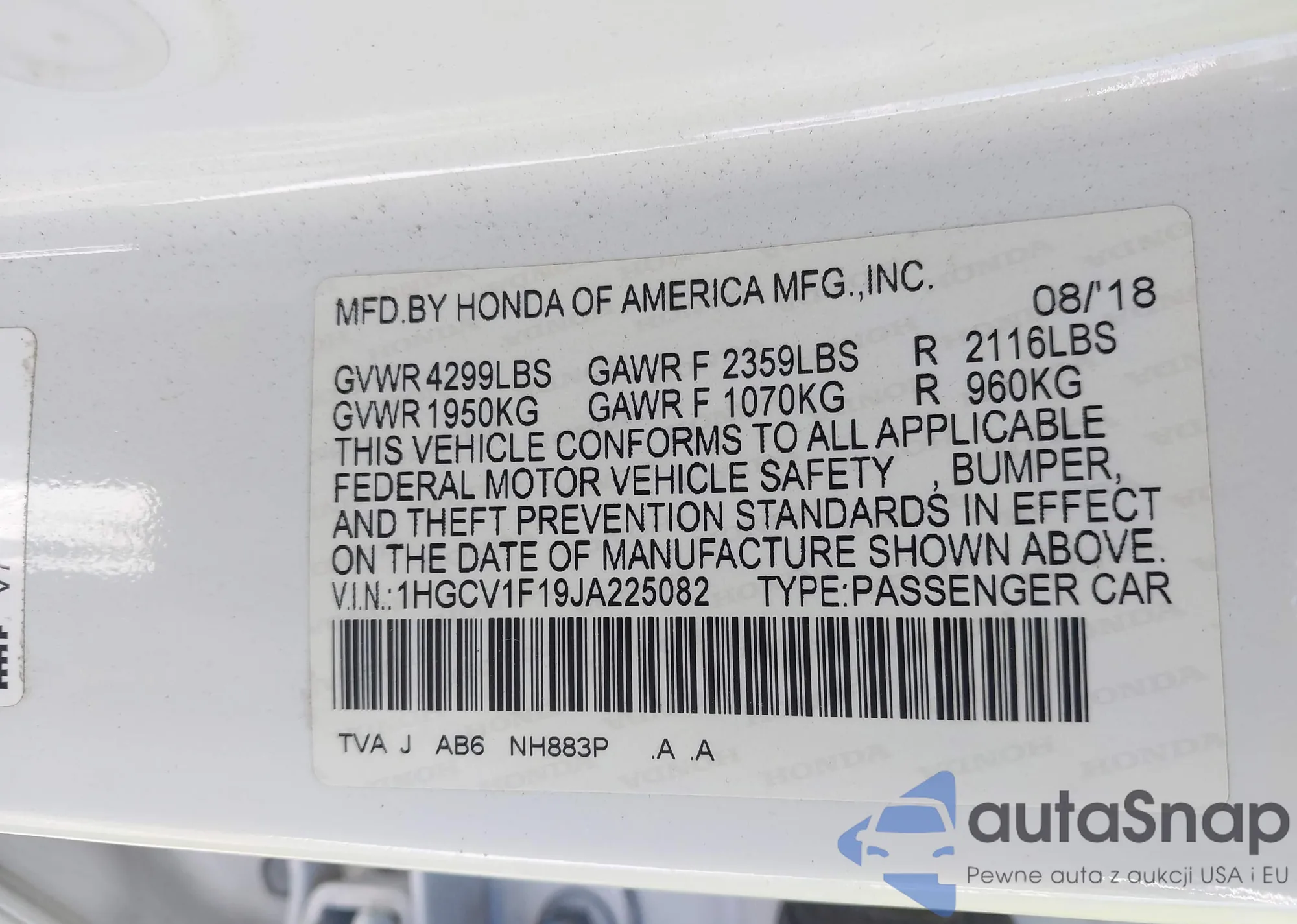 LOT: 42853330 VIN: 1HGCV1F19JA225082