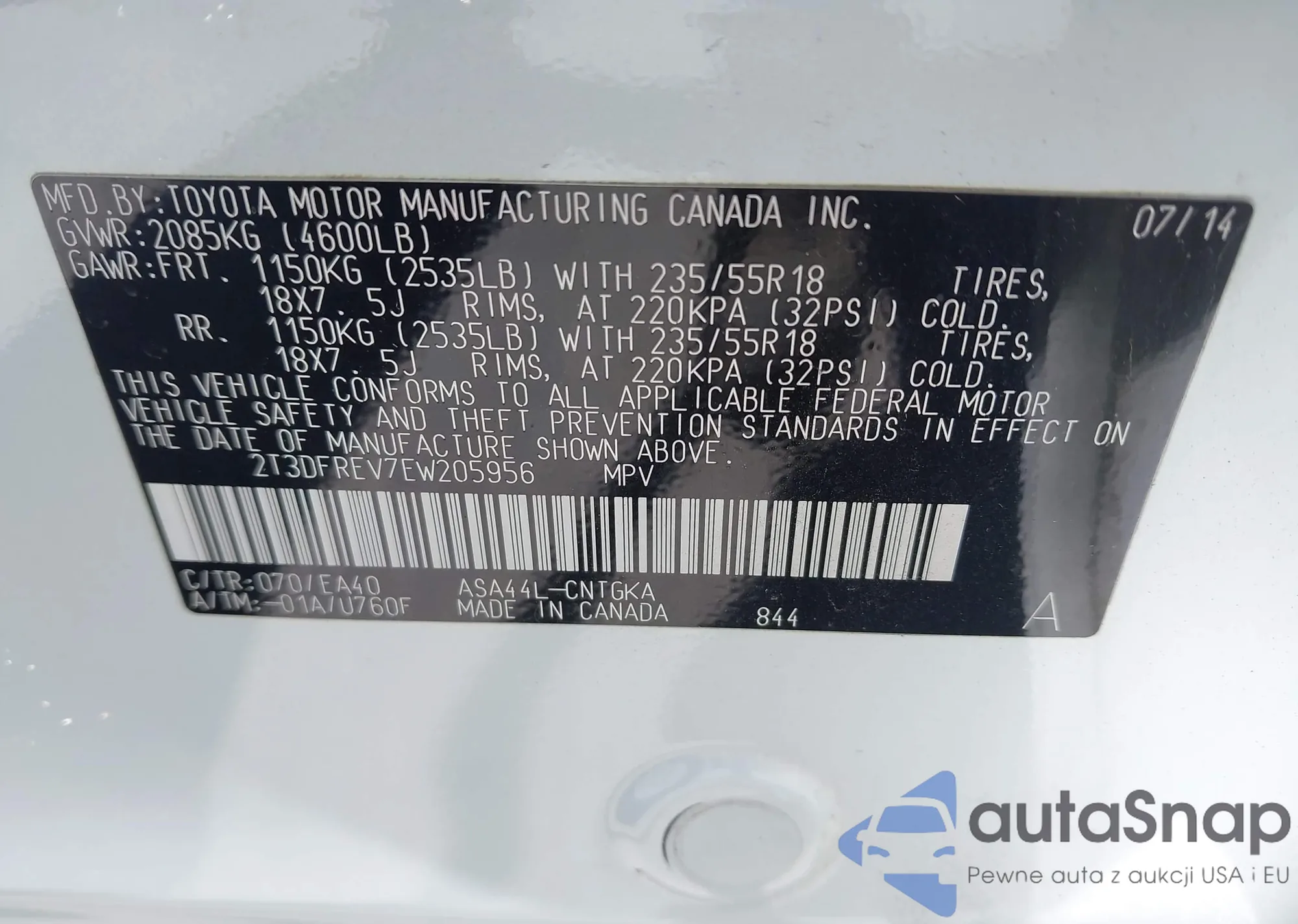 • VIN 2T3DFREV7EW205956