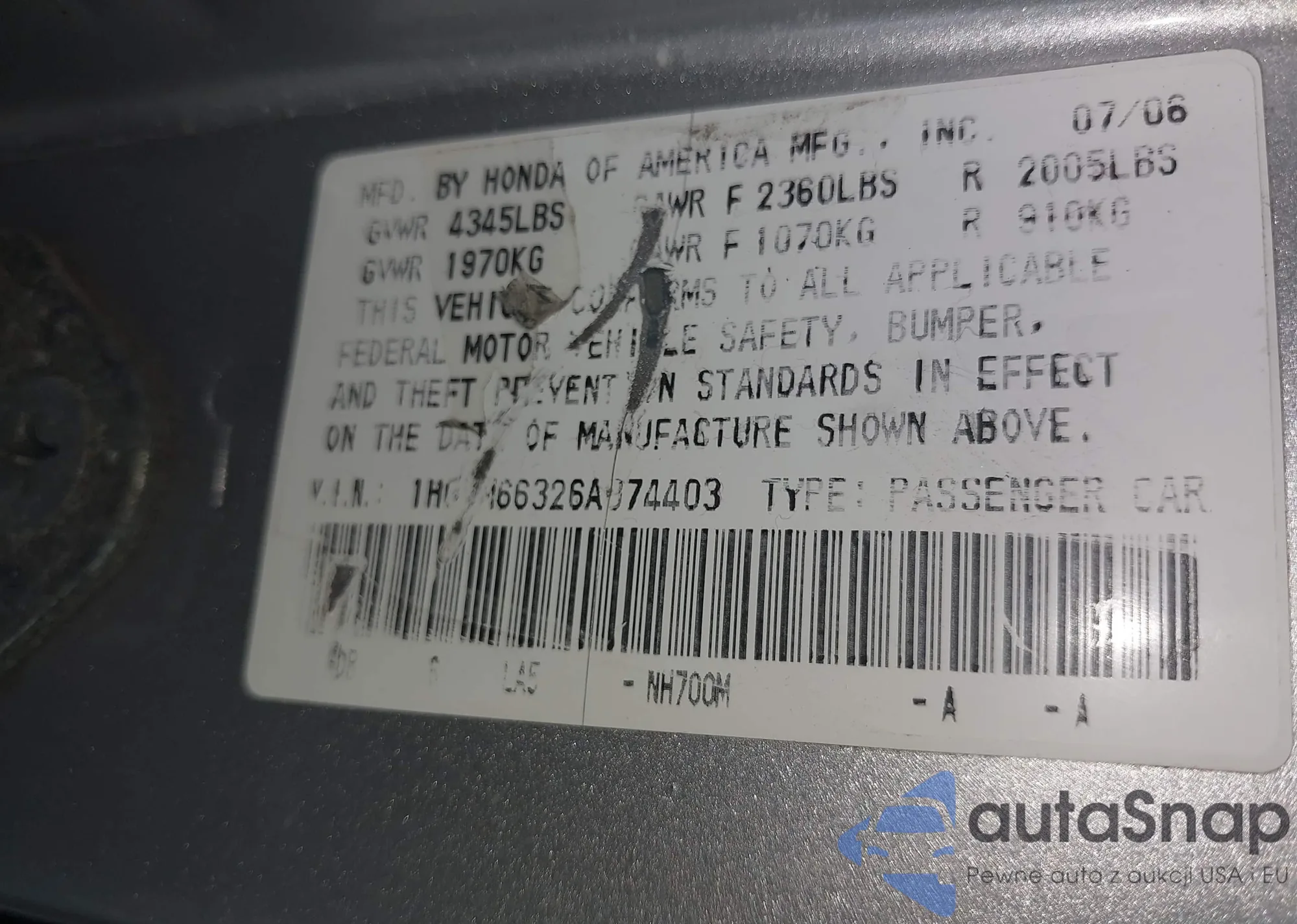 • VIN 1HGCM66326A074403