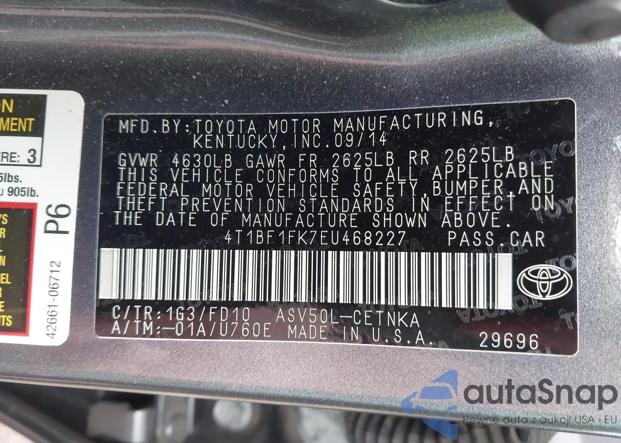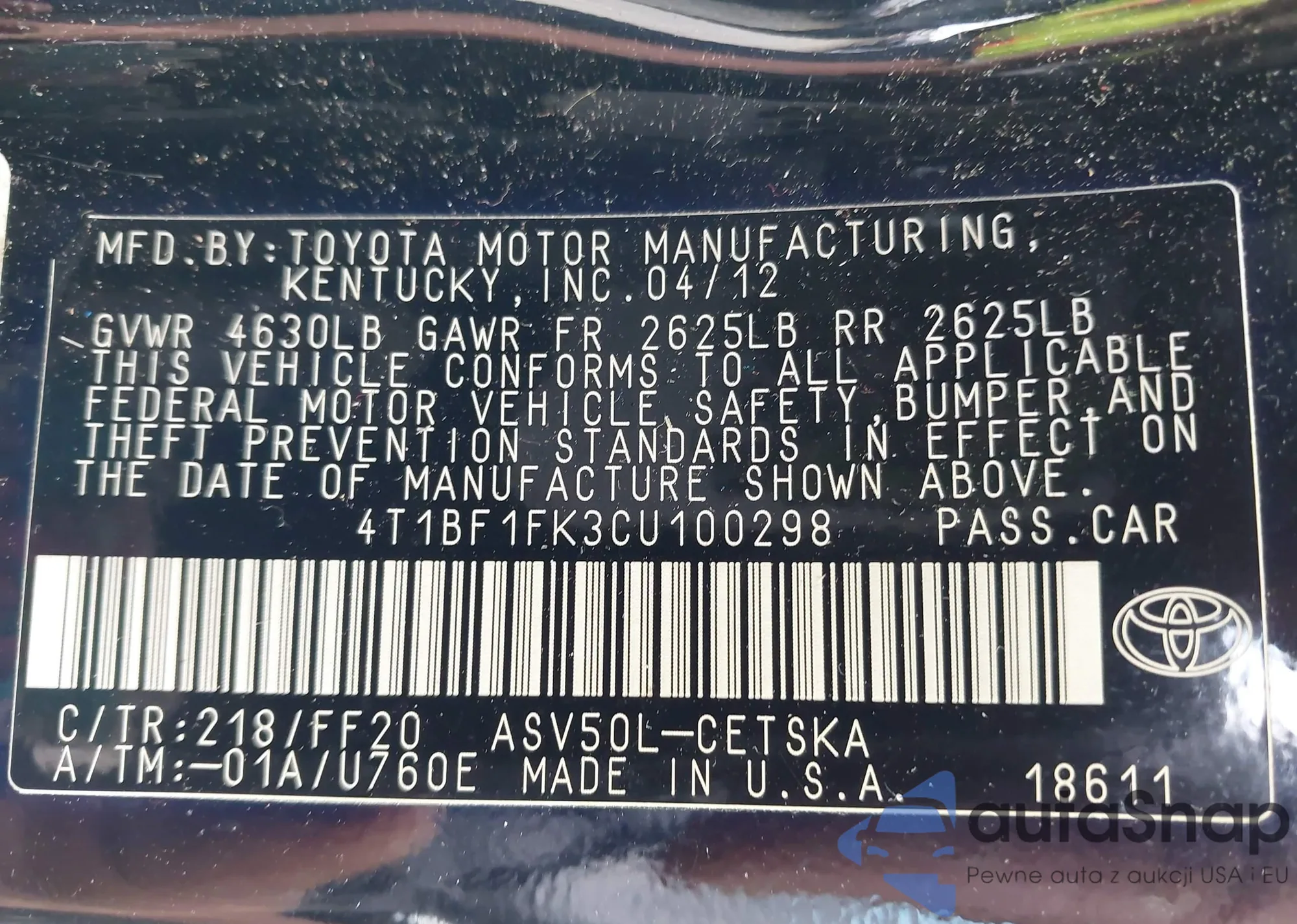 • VIN 4T1BF1FK3CU100298
