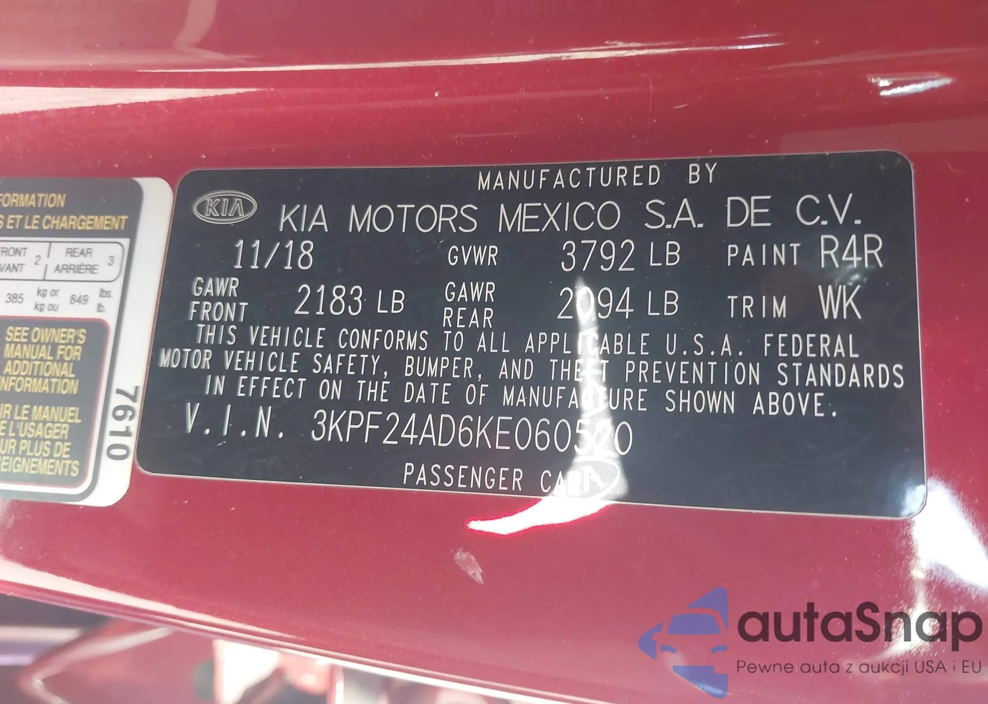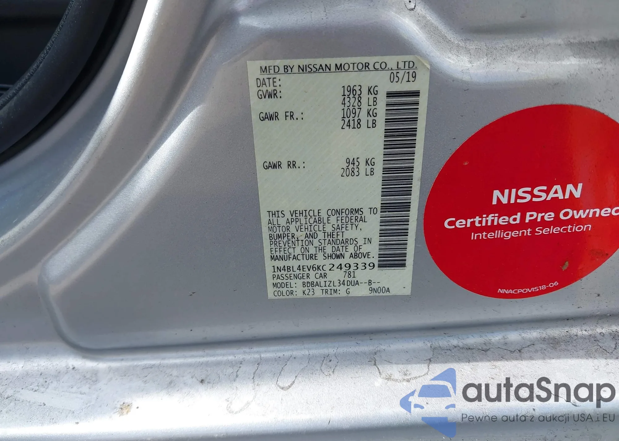 LOT: 41199946 VIN: 1N4BL4EV6KC249339