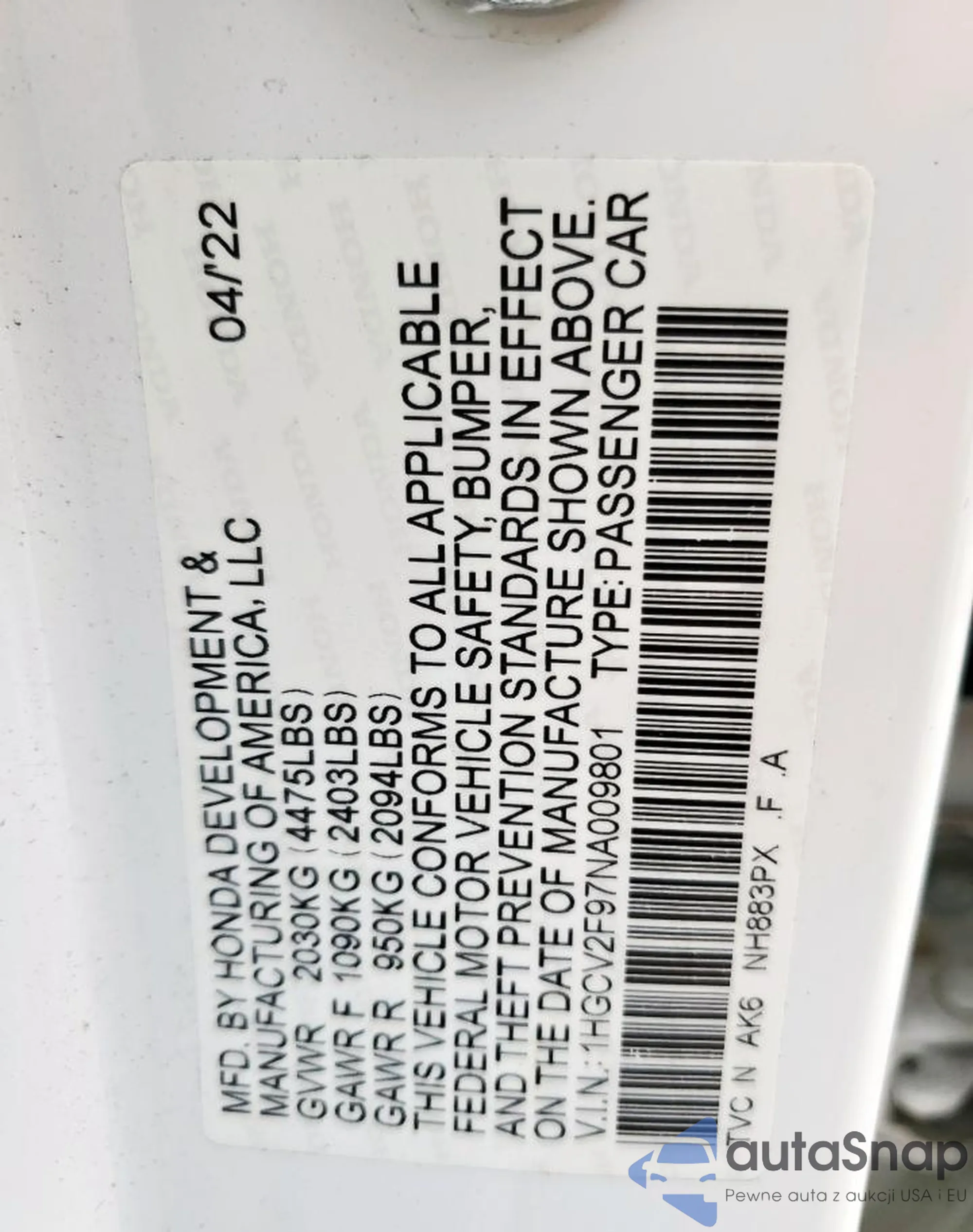 LOT: 61855215 VIN: 1HGCV2F97NA009801