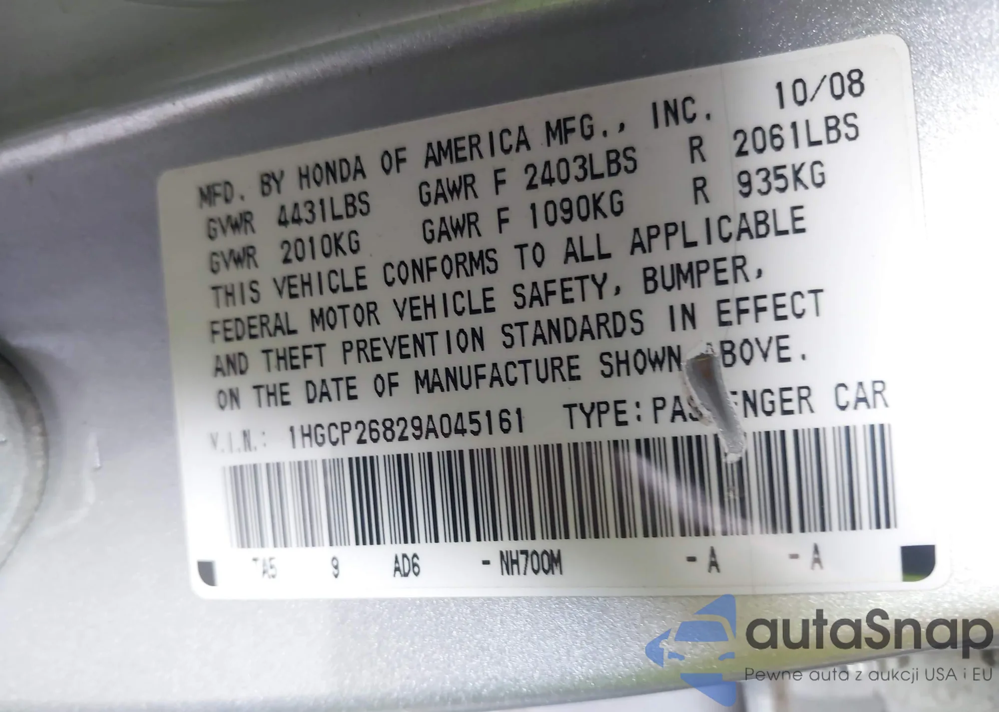 LOT: 42660177 VIN: 1HGCP26829A045161