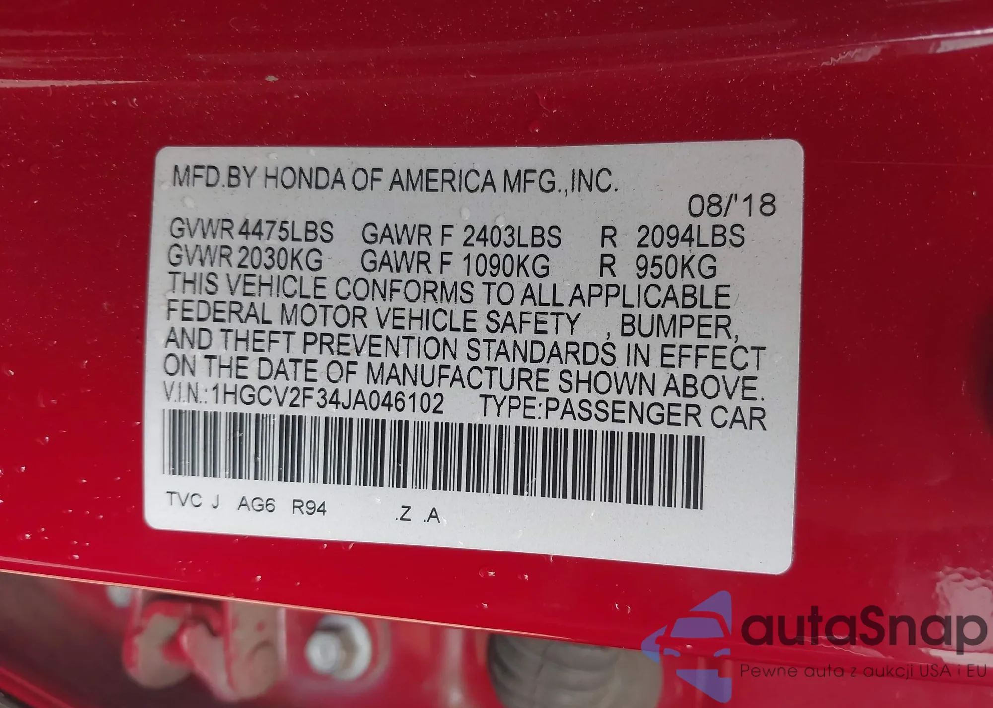 LOT: 42800642 VIN: 1HGCR2F3XDA102794