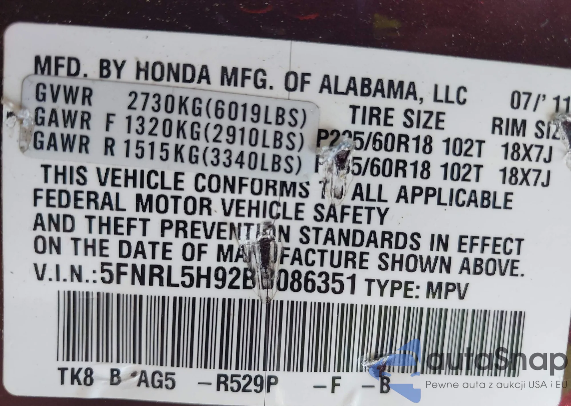 • VIN 5FNRL5H92BB086351