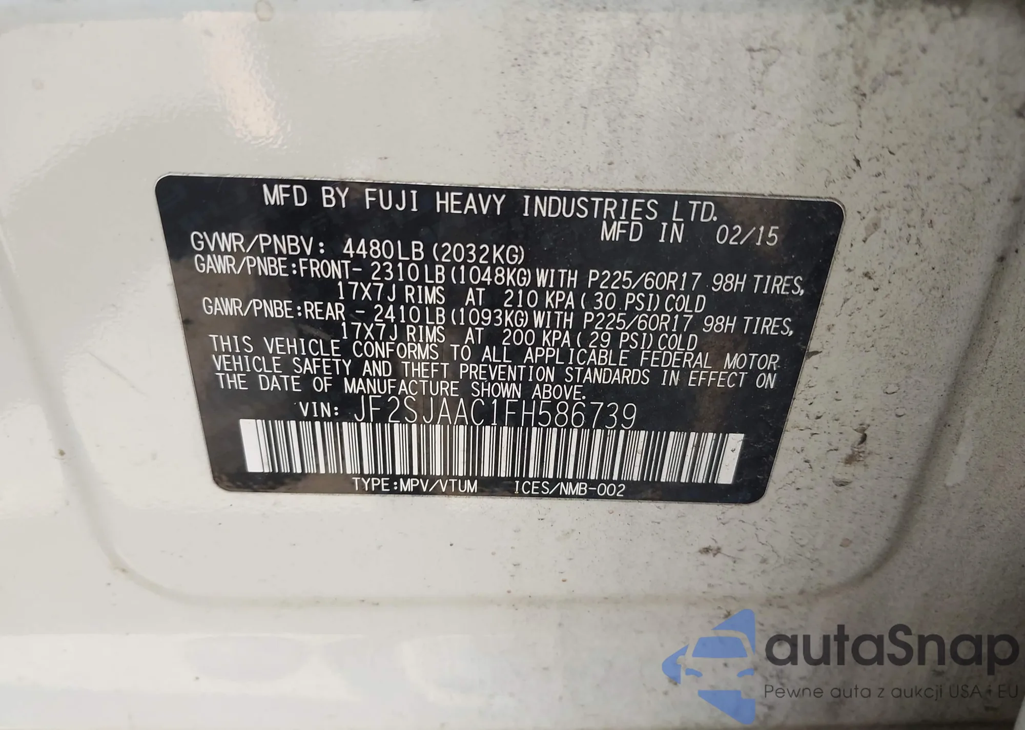 LOT: 42777068 VIN: JF2SJAAC1FH586739