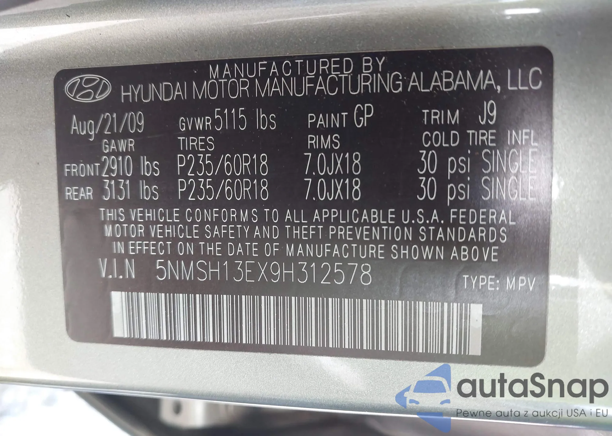 • VIN 5NMSH13EX9H312578