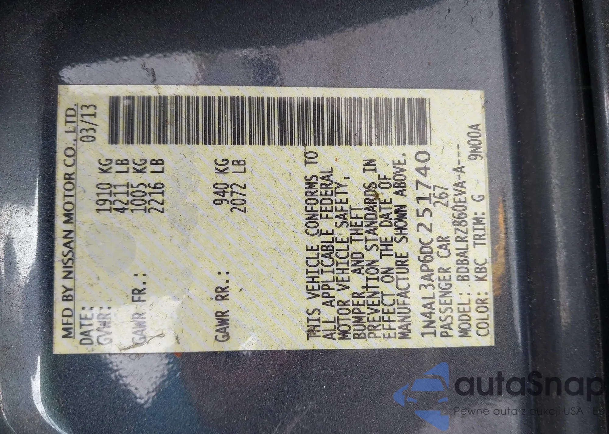 LOT: 42450261 VIN: 1N4AL3AP6DC251740
