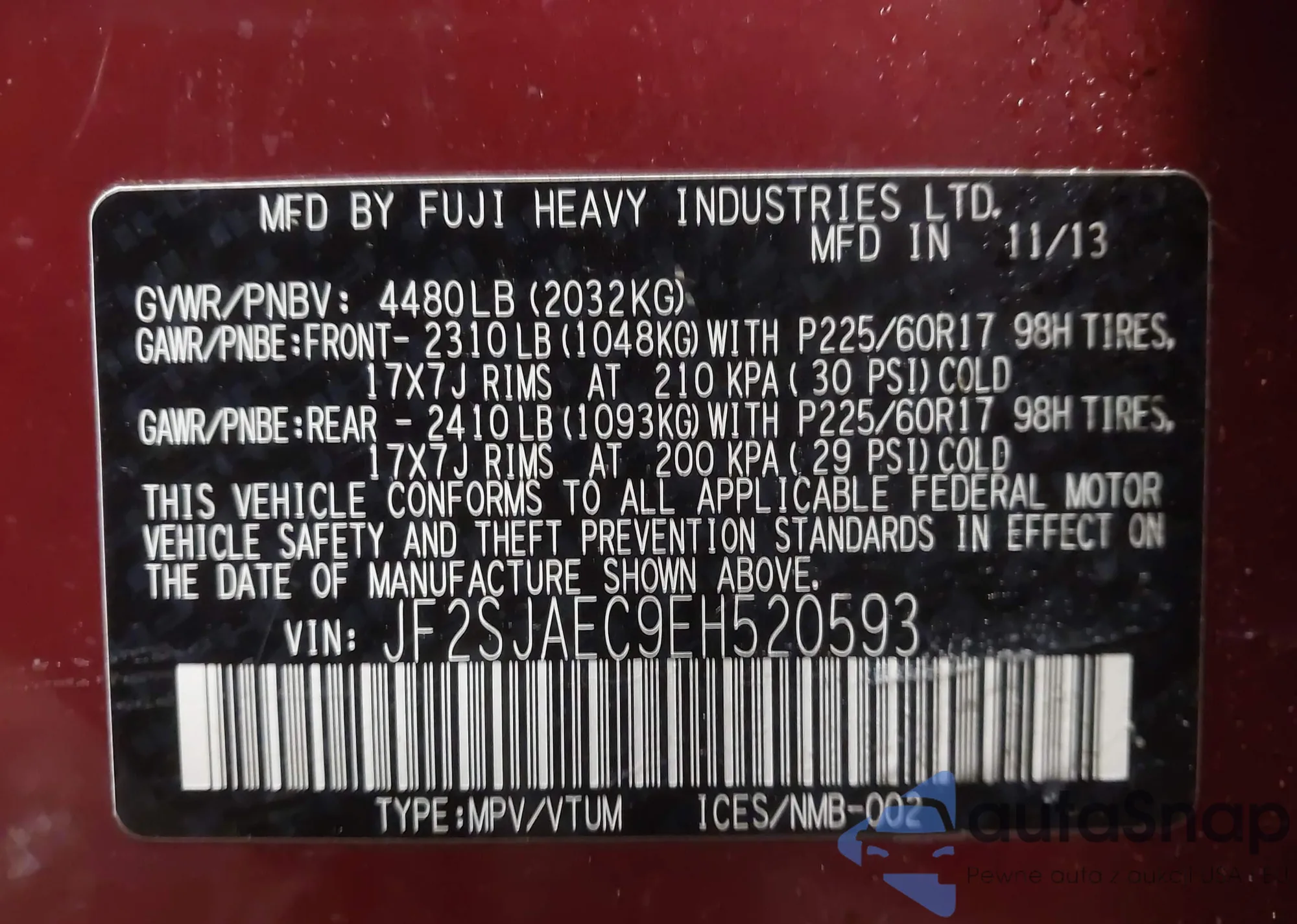 • VIN JF2SJAEC9EH520593