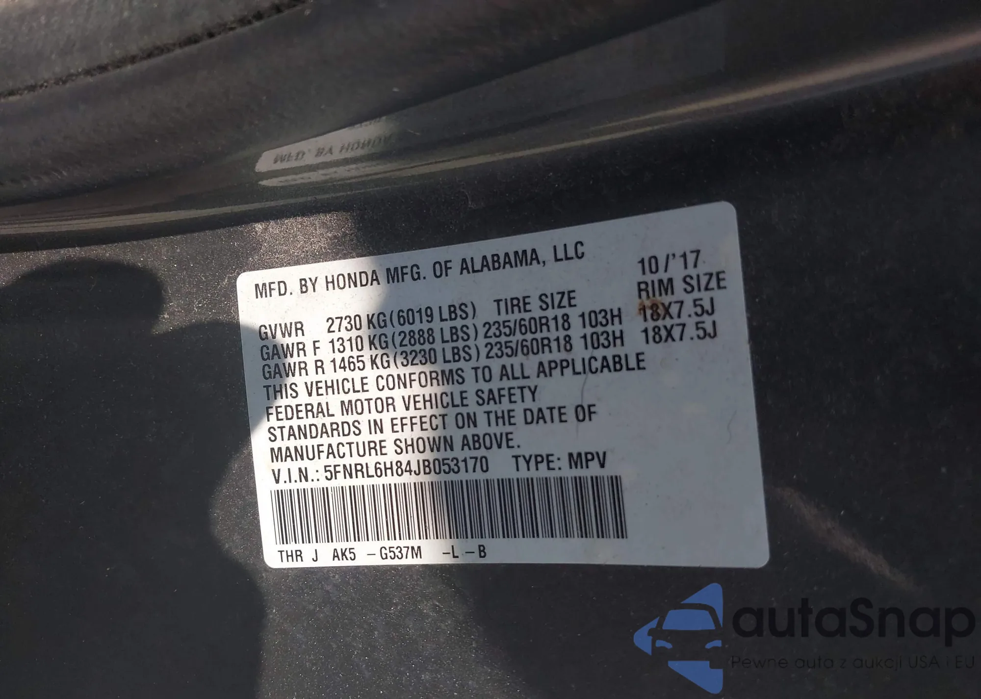 • VIN 5FNRL6H84JB053170