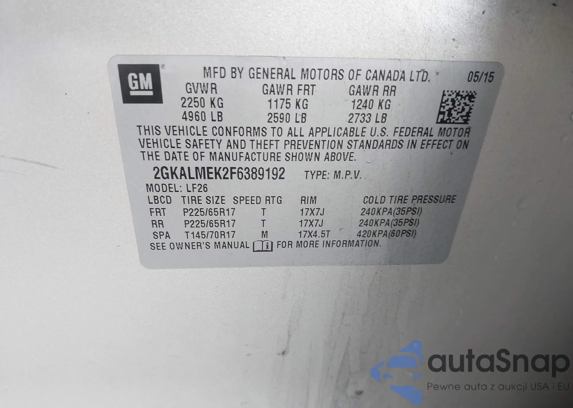 LOT: 42897007 VIN: 1GKKNPLS1HZ256465