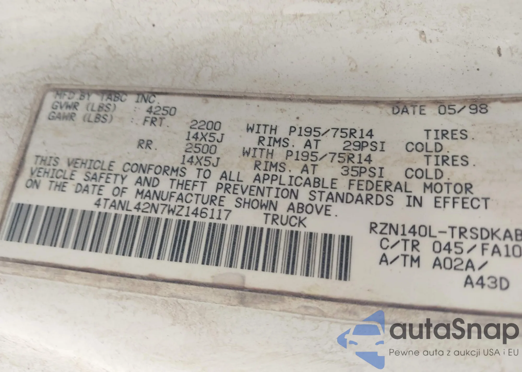 • VIN 4TANL42N7WZ146117