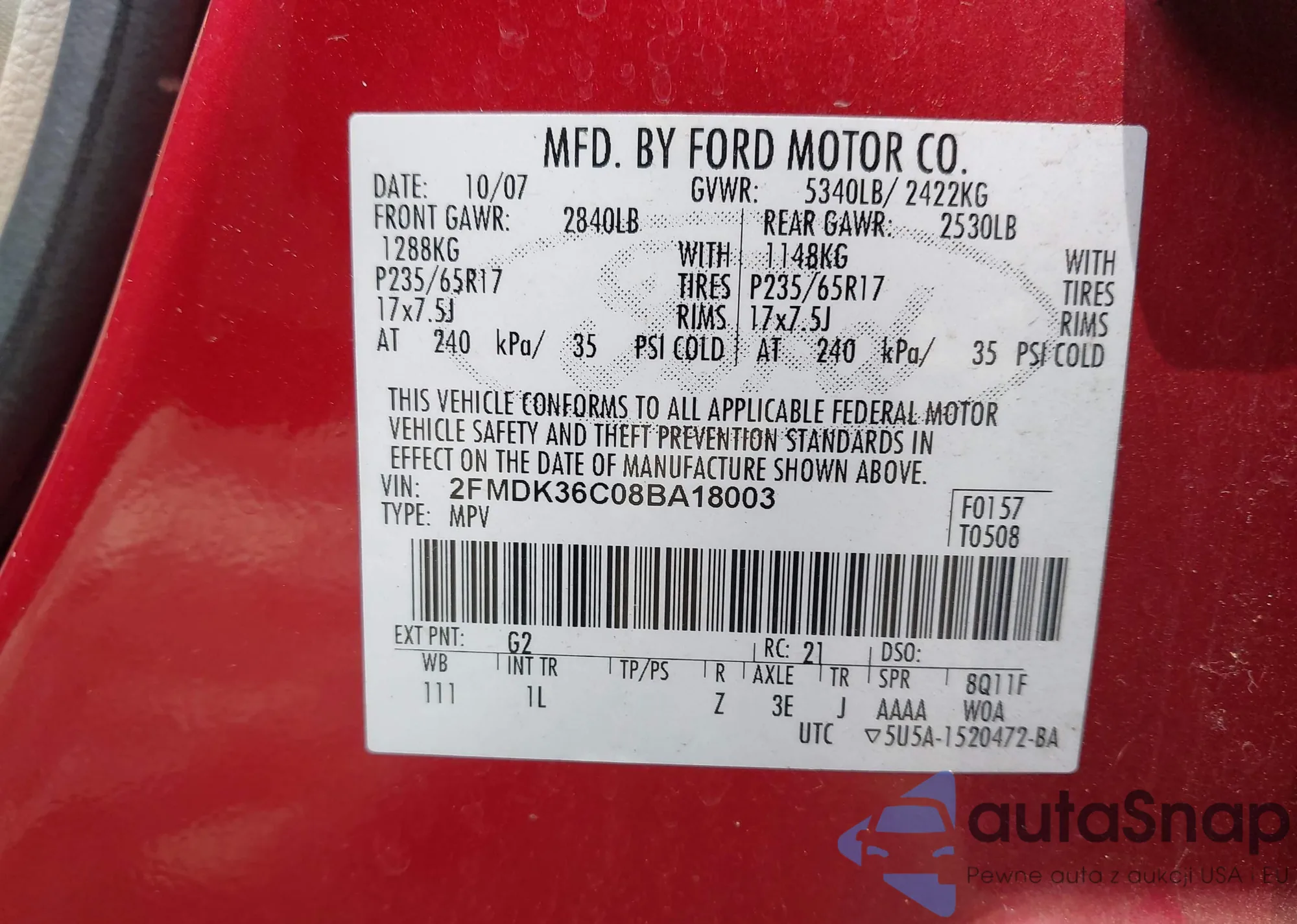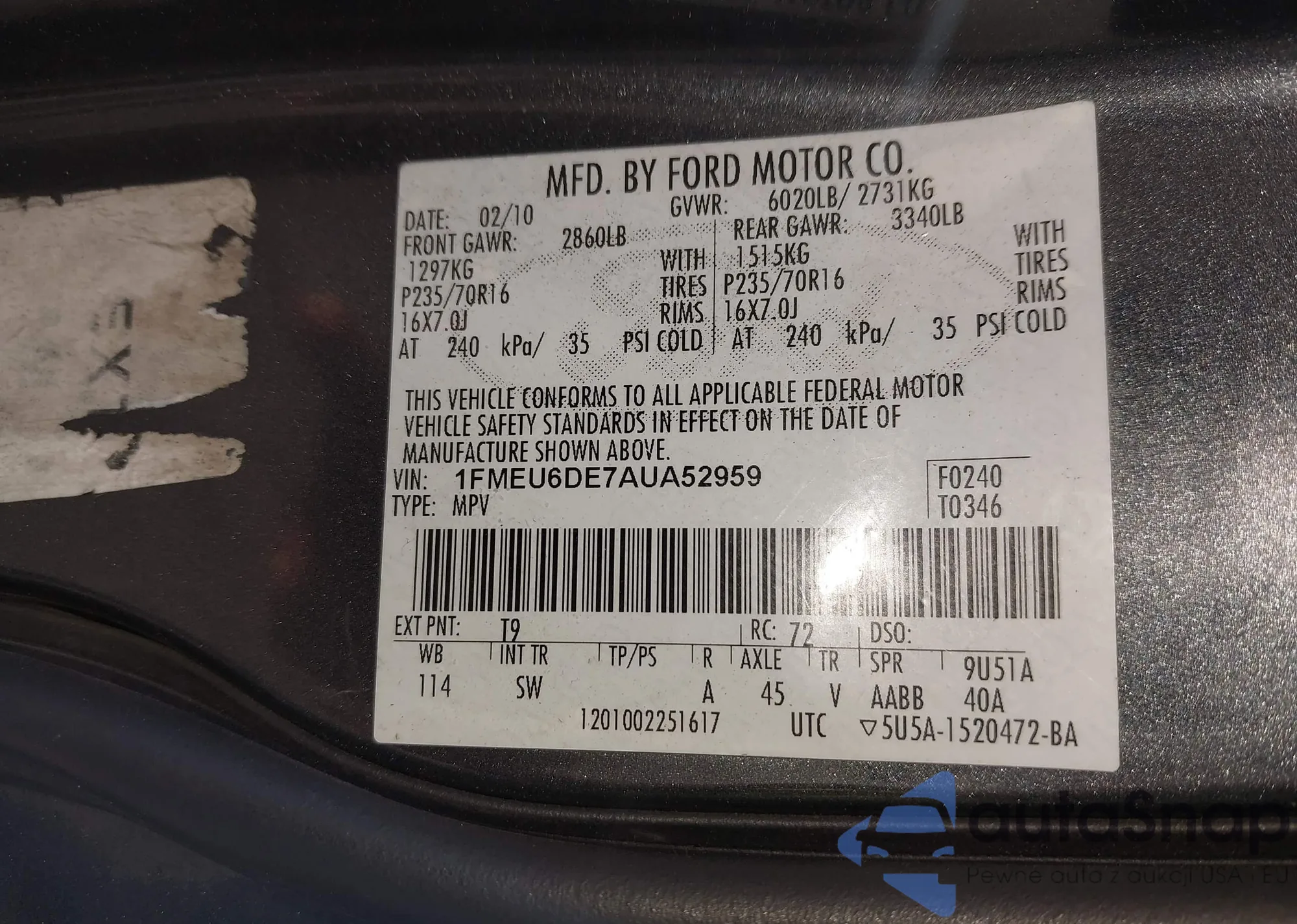 • VIN 1FMEU6DE7AUA52959