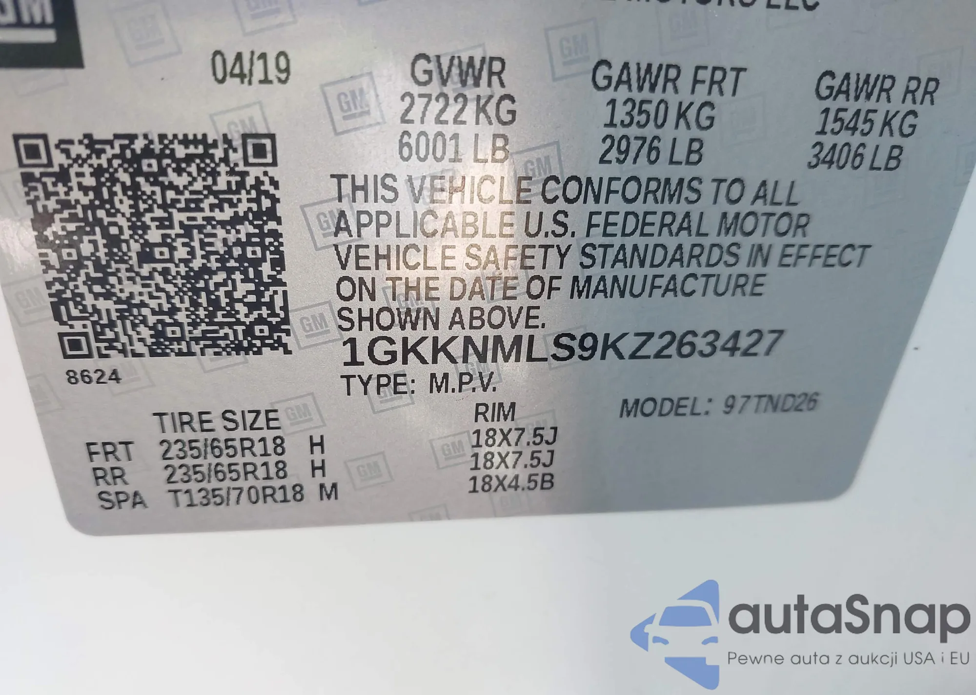 LOT: 42628327 VIN: 1GKKNMLS9KZ263427