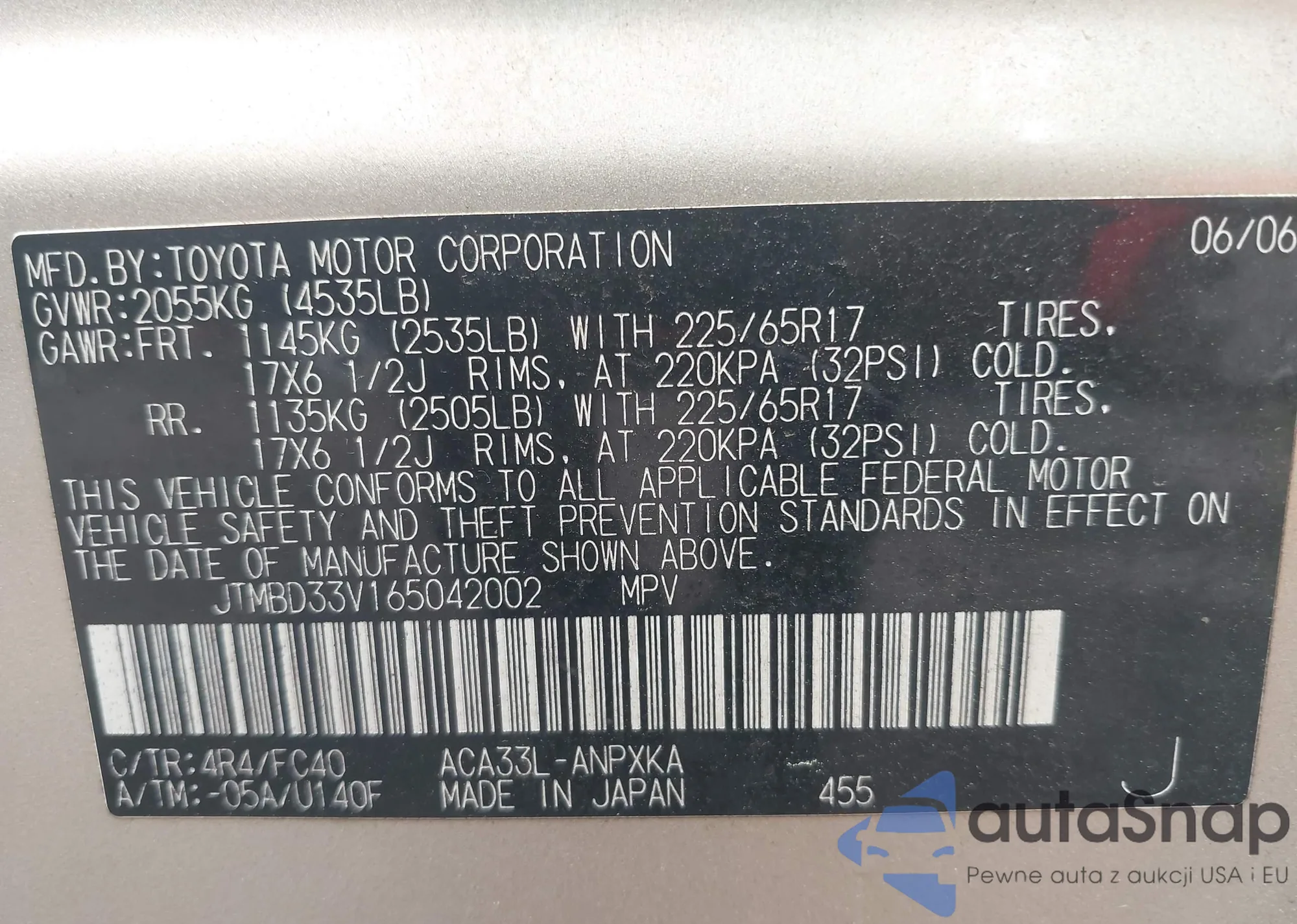 LOT: 42686535 VIN: JTMBD33V165042002