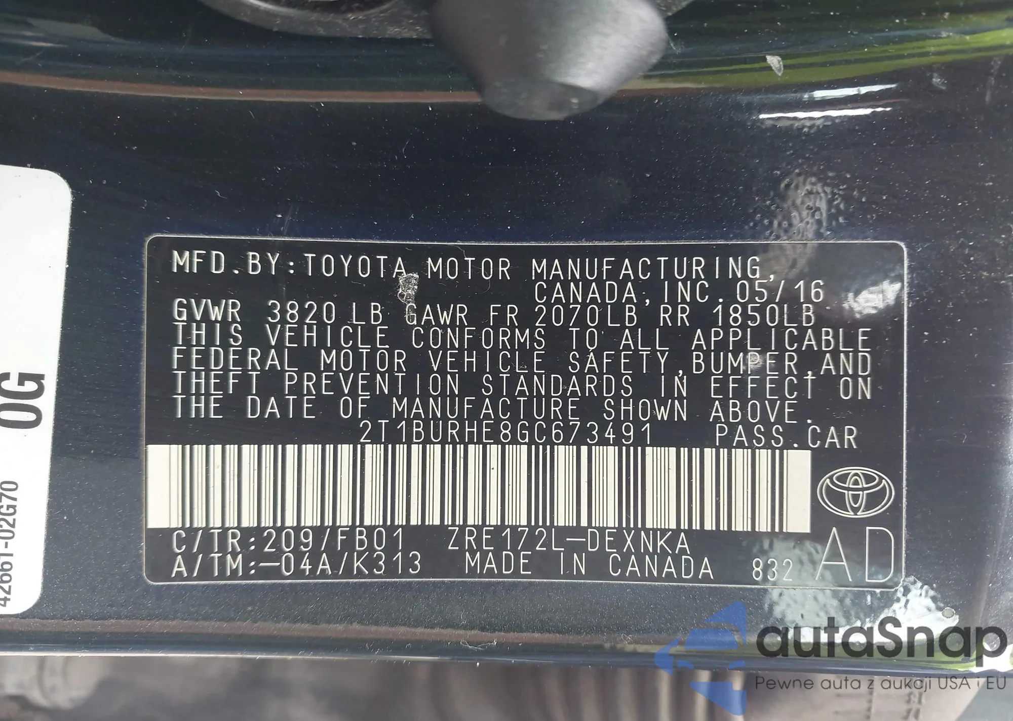 LOT: 42741773 VIN: 2T1BURHE8GC673491